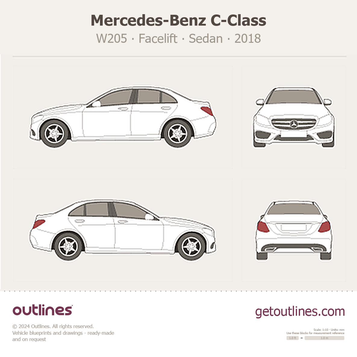 This is a blueprint of the C-Class, produced by carmaker Mercedes-Benz in 2018 - Present (2025, 2026). It features a Sedan body design and is classified as a Luxury vehicle.