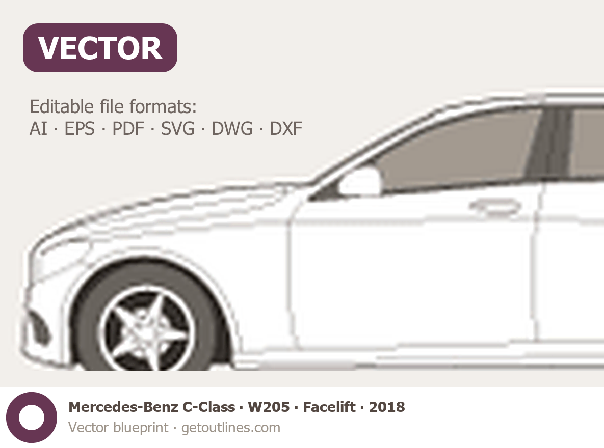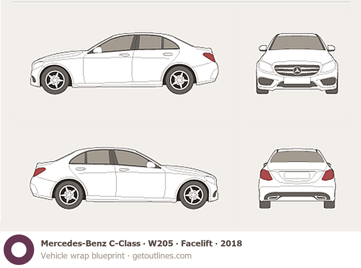 This 2018 Mercedes-Benz C-Class W205 Facelift Sedan blueprint helps designers, wrap studios, and 3D artists simplify their workflow and save valuable time for creative work instead of routine tasks.