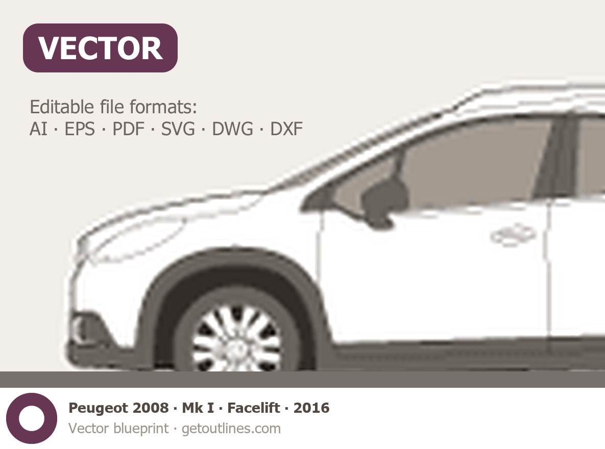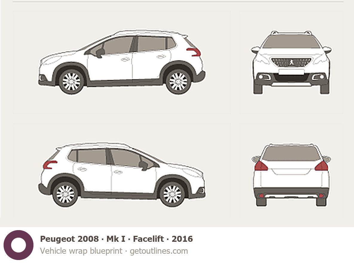 This 2016 Peugeot 2008 Mk I Facelift SUV blueprint helps designers, wrap studios, and 3D artists simplify their workflow and save valuable time for creative work instead of routine tasks.