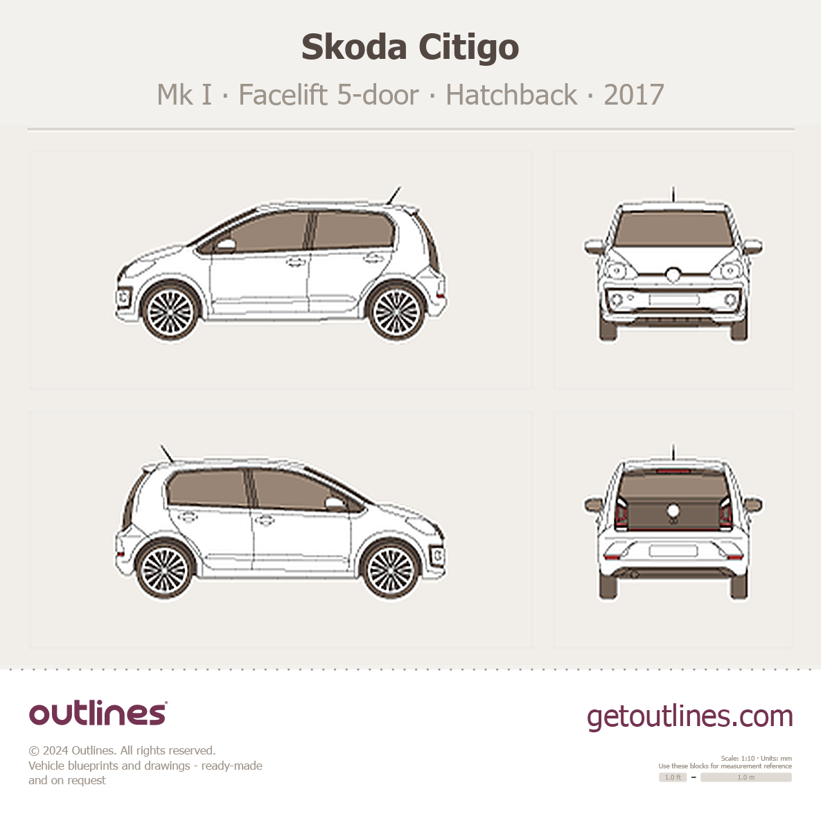 This is a blueprint of the Citigo, produced by carmaker Skoda in 2017 - Present (2025, 2026). It features a Hatchback body design and is classified as a Family vehicle.