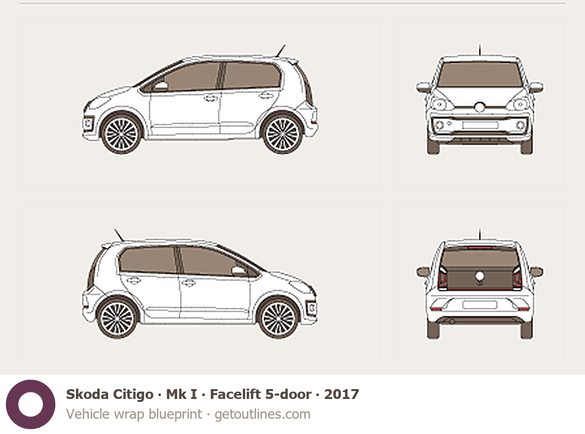 This template is suitable for Skoda Citigo models from 2017, including 2017, 2018, 2019, 2020, and 2026 model years, and is commonly used for vehicle wrap and signage design.