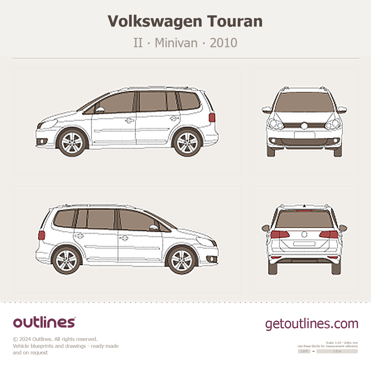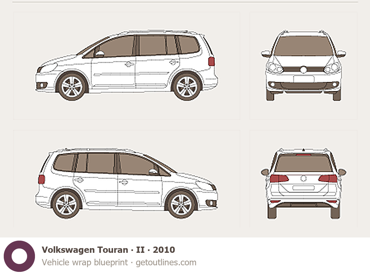 This 2010 Volkswagen Touran II Minivan blueprint helps designers, wrap studios, and 3D artists simplify their workflow and save valuable time for creative work instead of routine tasks.