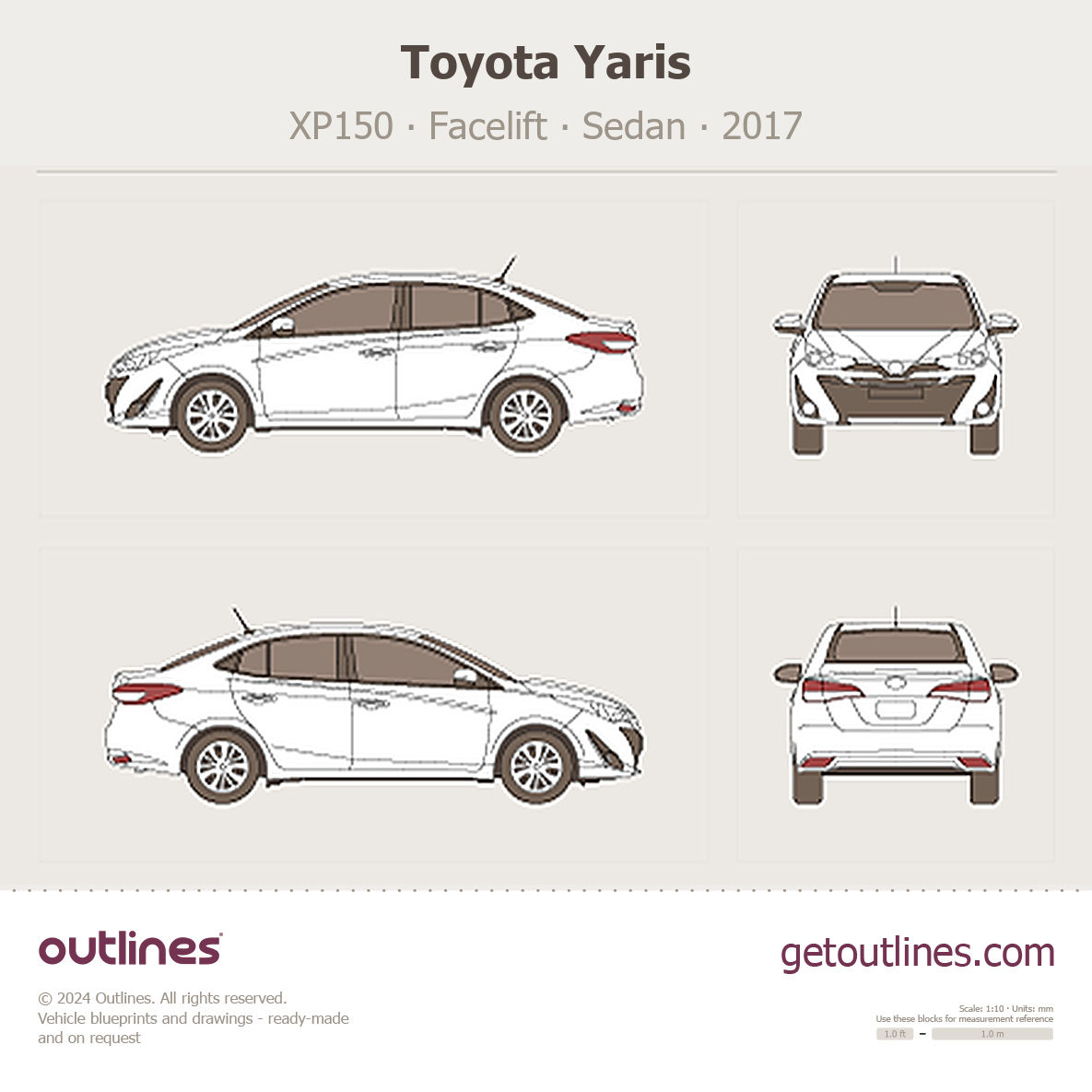 This is a blueprint of the Yaris, produced by carmaker Toyota in 2017 - Present (2025, 2026). It features a Sedan body design and is classified as a Family vehicle.