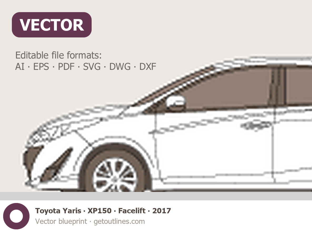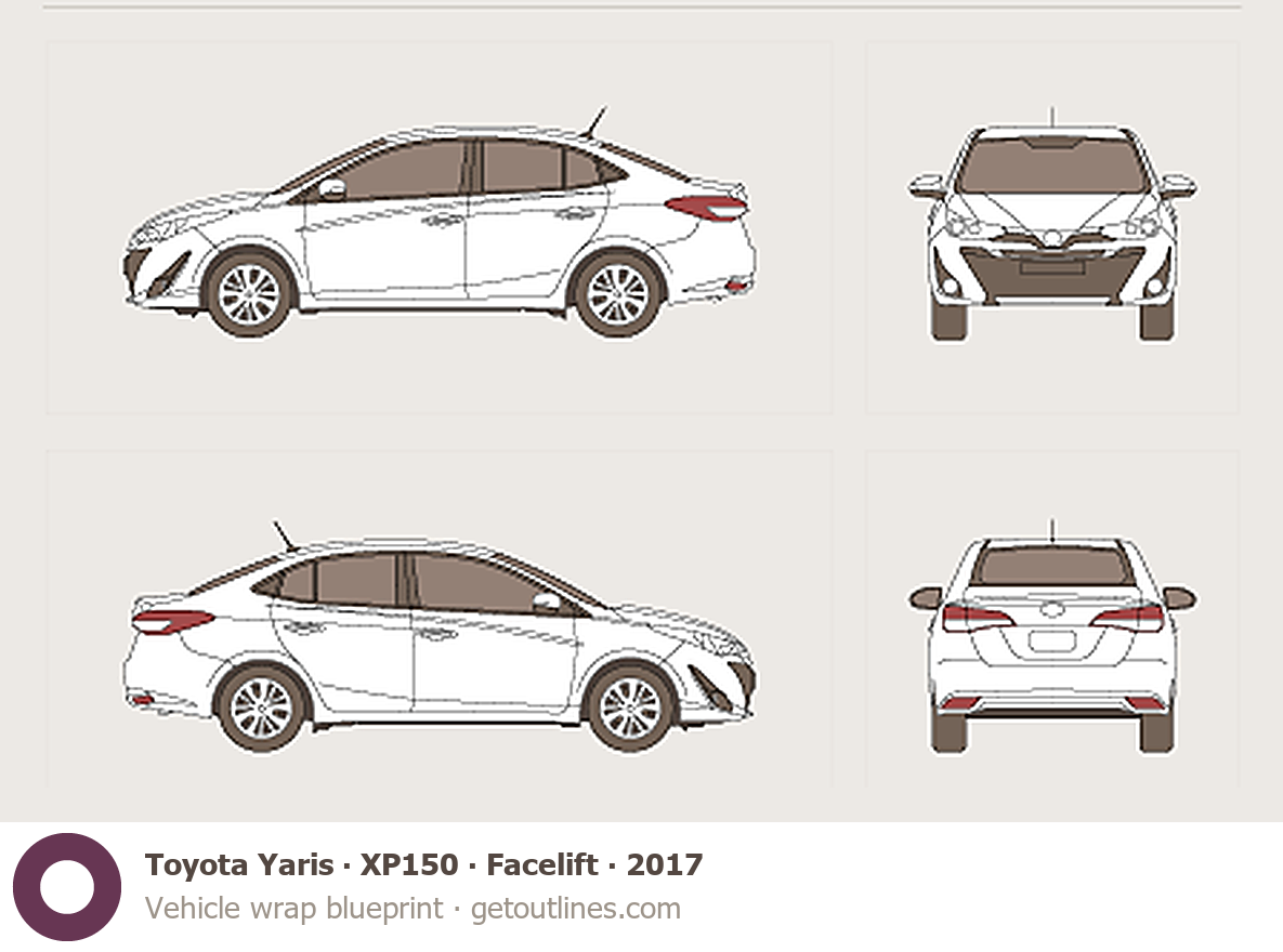This 2017 Toyota Yaris XP150 Facelift Sedan blueprint helps designers, wrap studios, and 3D artists simplify their workflow and save valuable time for creative work instead of routine tasks.