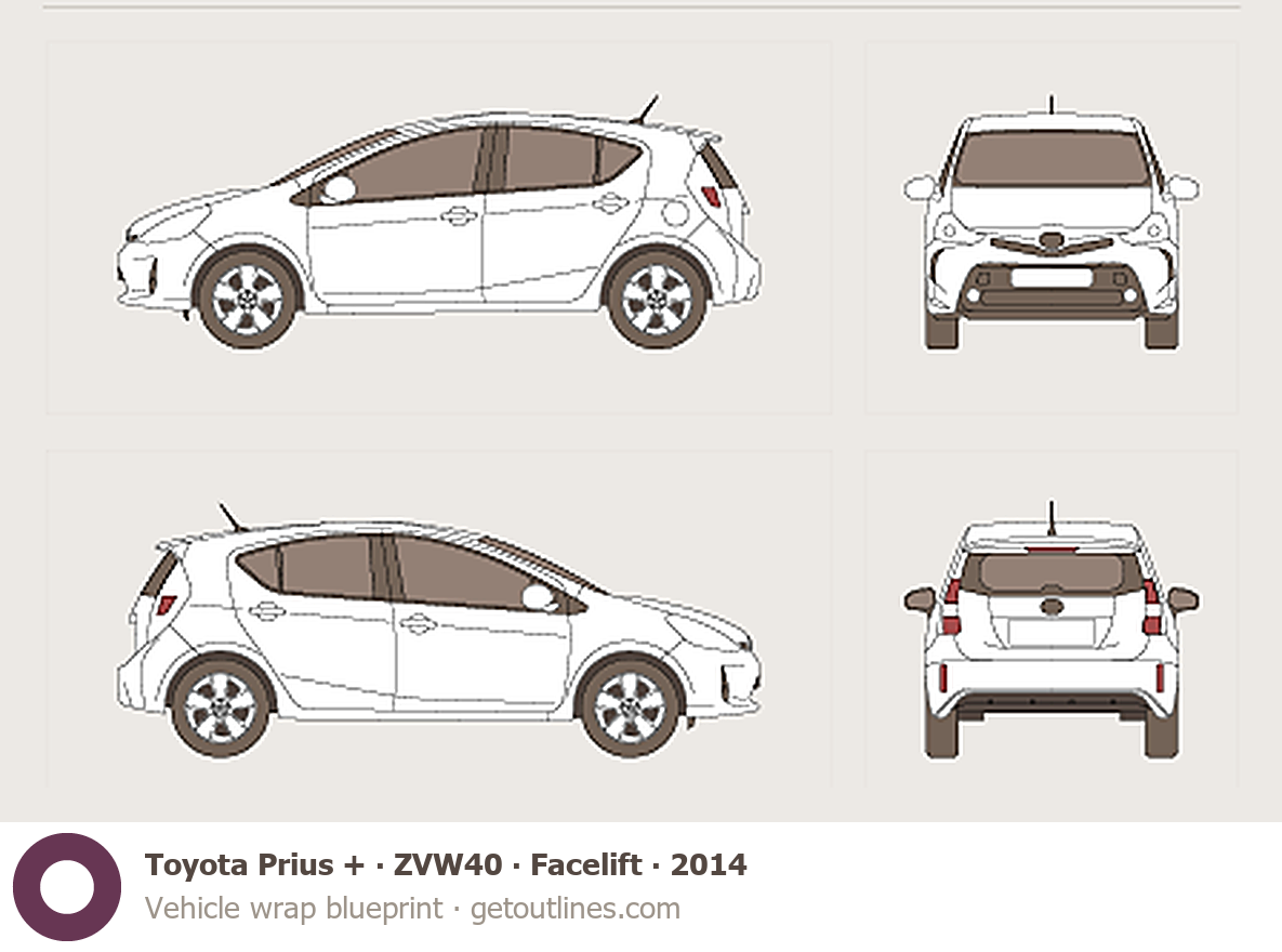 This 2014 Toyota Prius + ZVW40 Facelift Wagon blueprint helps designers, wrap studios, and 3D artists simplify their workflow and save valuable time for creative work instead of routine tasks.