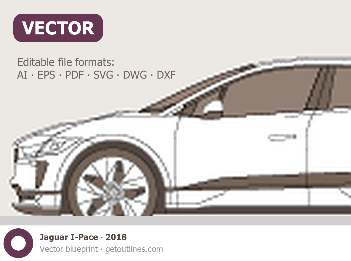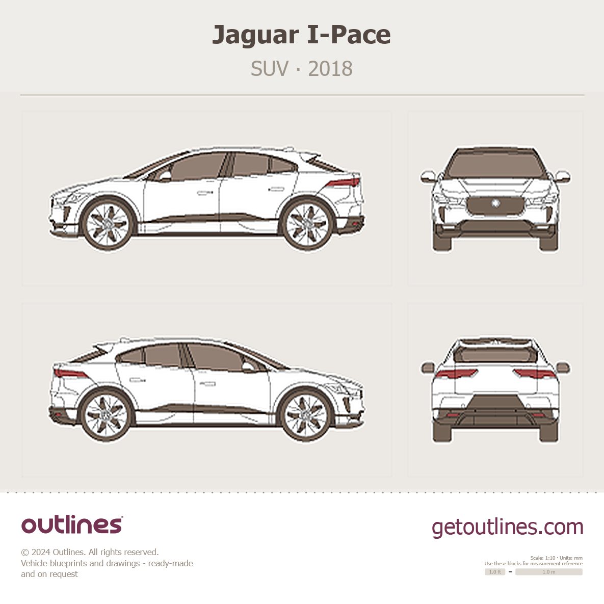This is a blueprint of the I-Pace, produced by carmaker Jaguar in 2018 - Present (2025, 2026). It features a SUV body design and is classified as a Luxury vehicle.