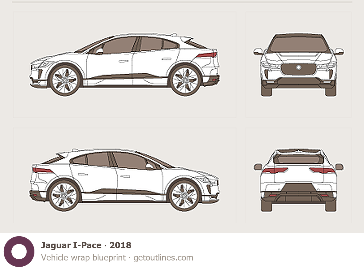 This 2018 Jaguar I-Pace SUV blueprint helps designers, wrap studios, and 3D artists simplify their workflow and save valuable time for creative work instead of routine tasks.