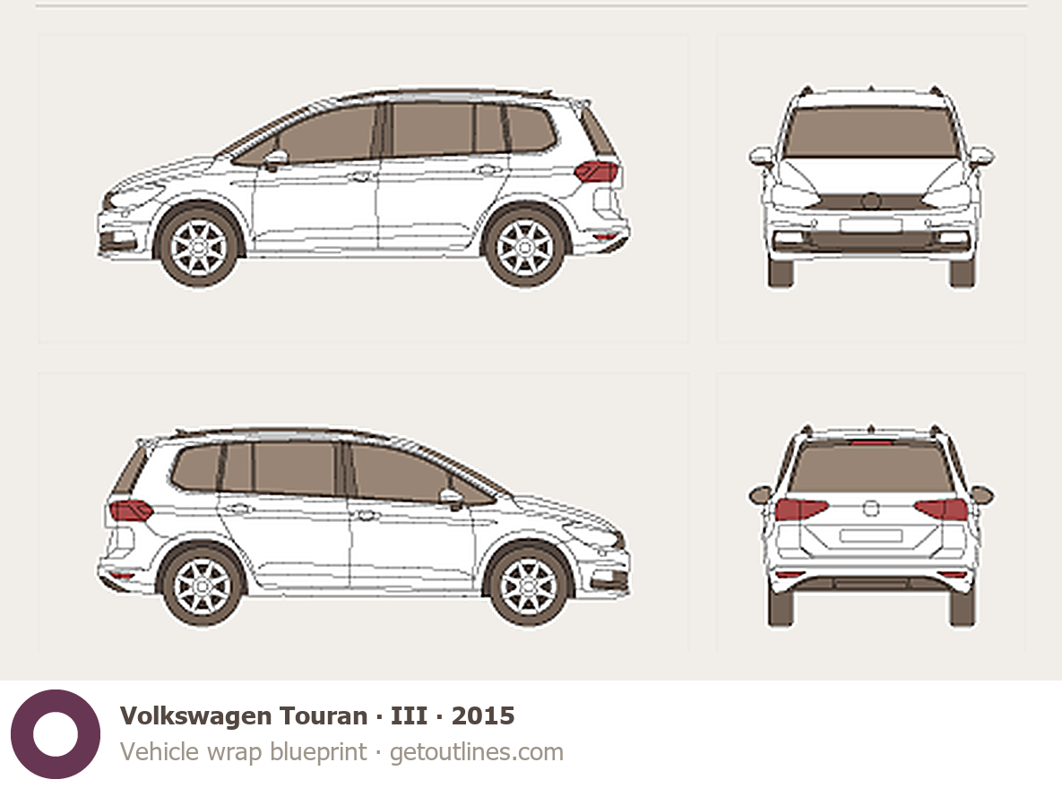 This 2015 Volkswagen Touran III Minivan blueprint helps designers, wrap studios, and 3D artists simplify their workflow and save valuable time for creative work instead of routine tasks.