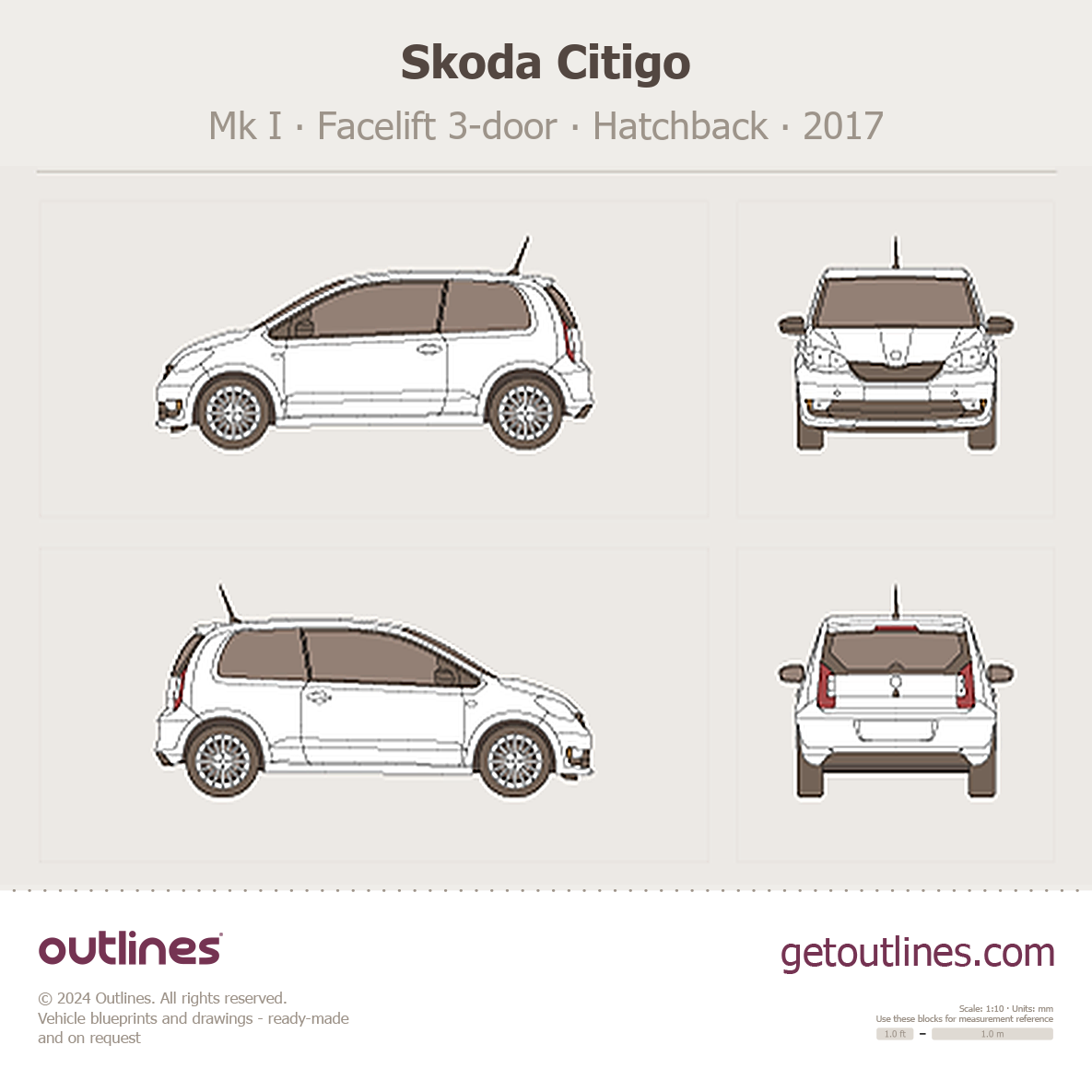 This is a blueprint of the Citigo, produced by carmaker Skoda in 2017 - Present (2025, 2026). It features a Hatchback body design and is classified as a Family vehicle.