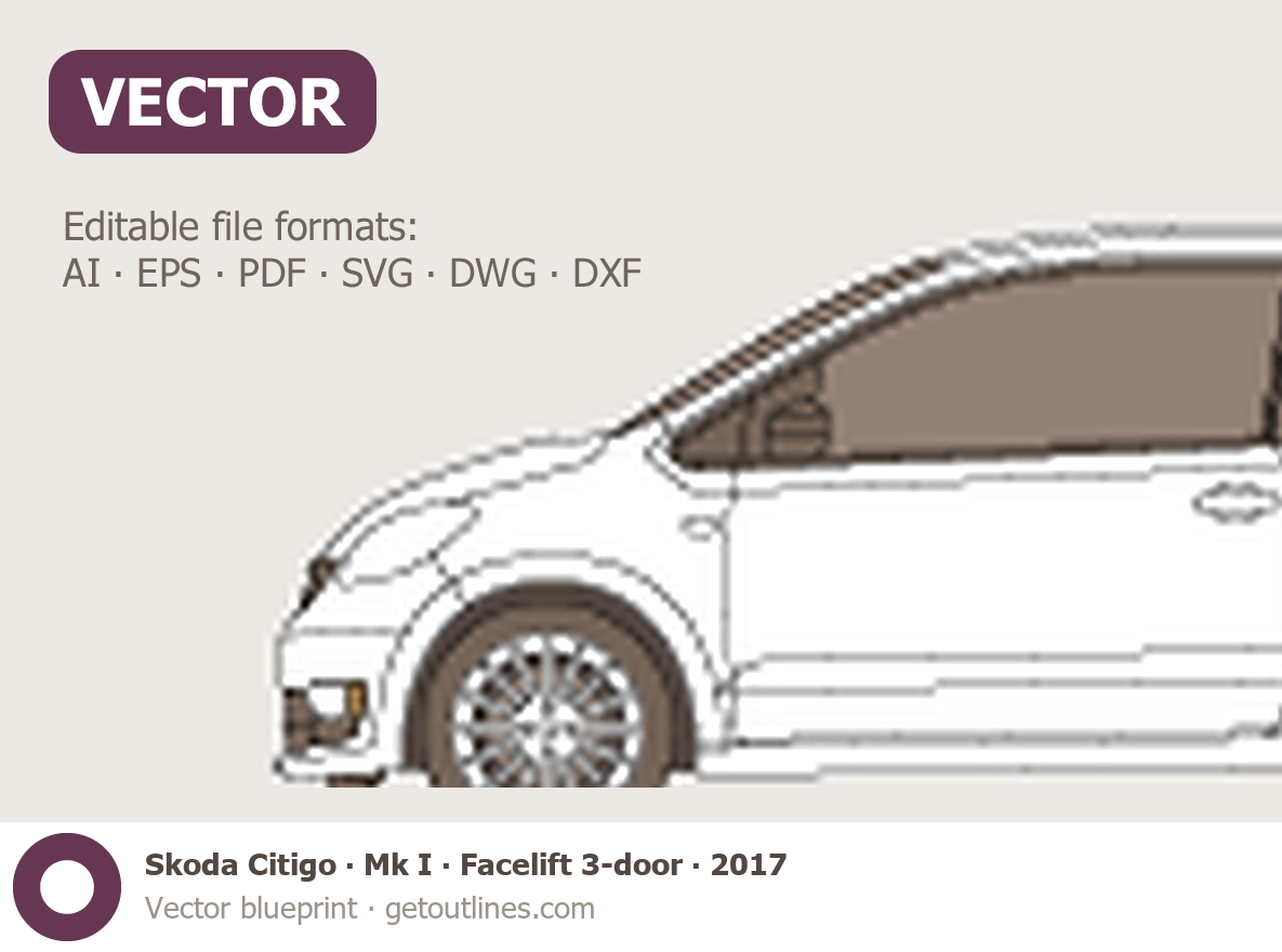This 2017 Skoda Citigo Mk I Facelift 3-door Hatchback blueprint helps designers, wrap studios, and 3D artists simplify their workflow and save valuable time for creative work instead of routine tasks.