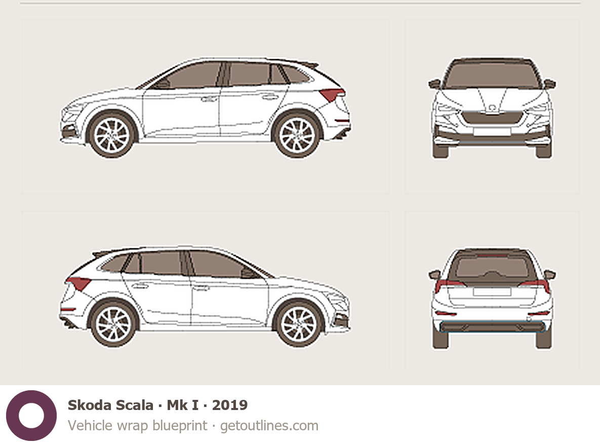 This template is suitable for Skoda Scala models from 2019, including 2019, 2020, 2021, 2022, and 2026 model years, and is commonly used for vehicle wrap and signage design.