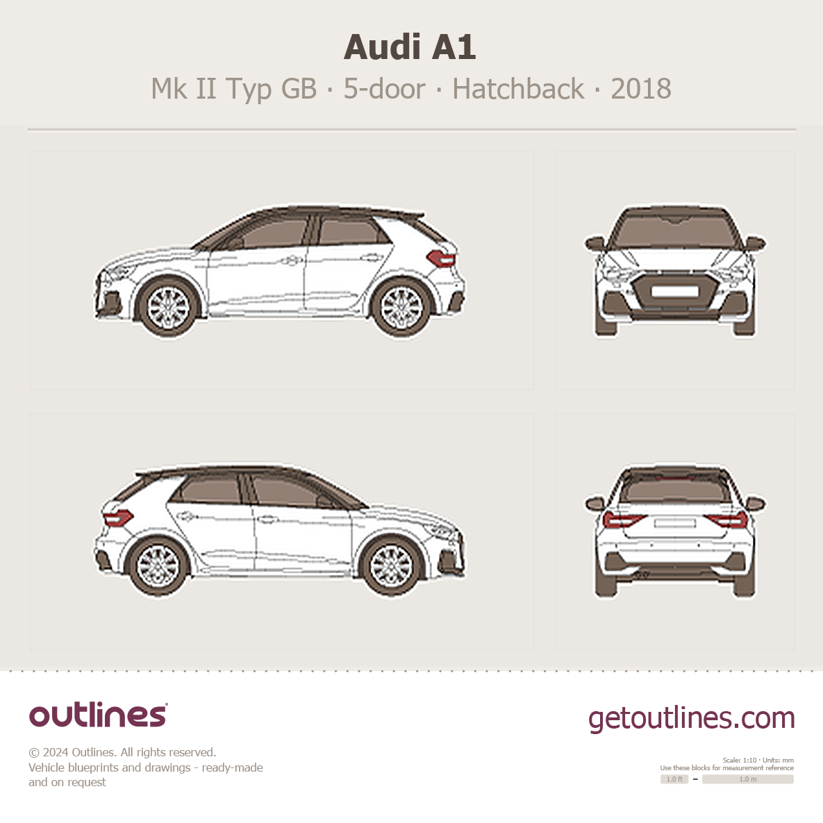 This is a blueprint of the A1, produced by carmaker Audi in 2018 - Present (2025, 2026). It features a Hatchback body design and is classified as a Compact vehicle.