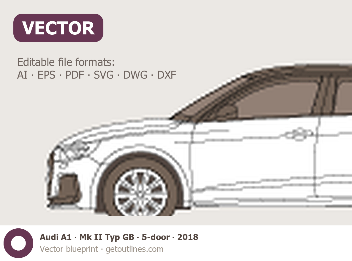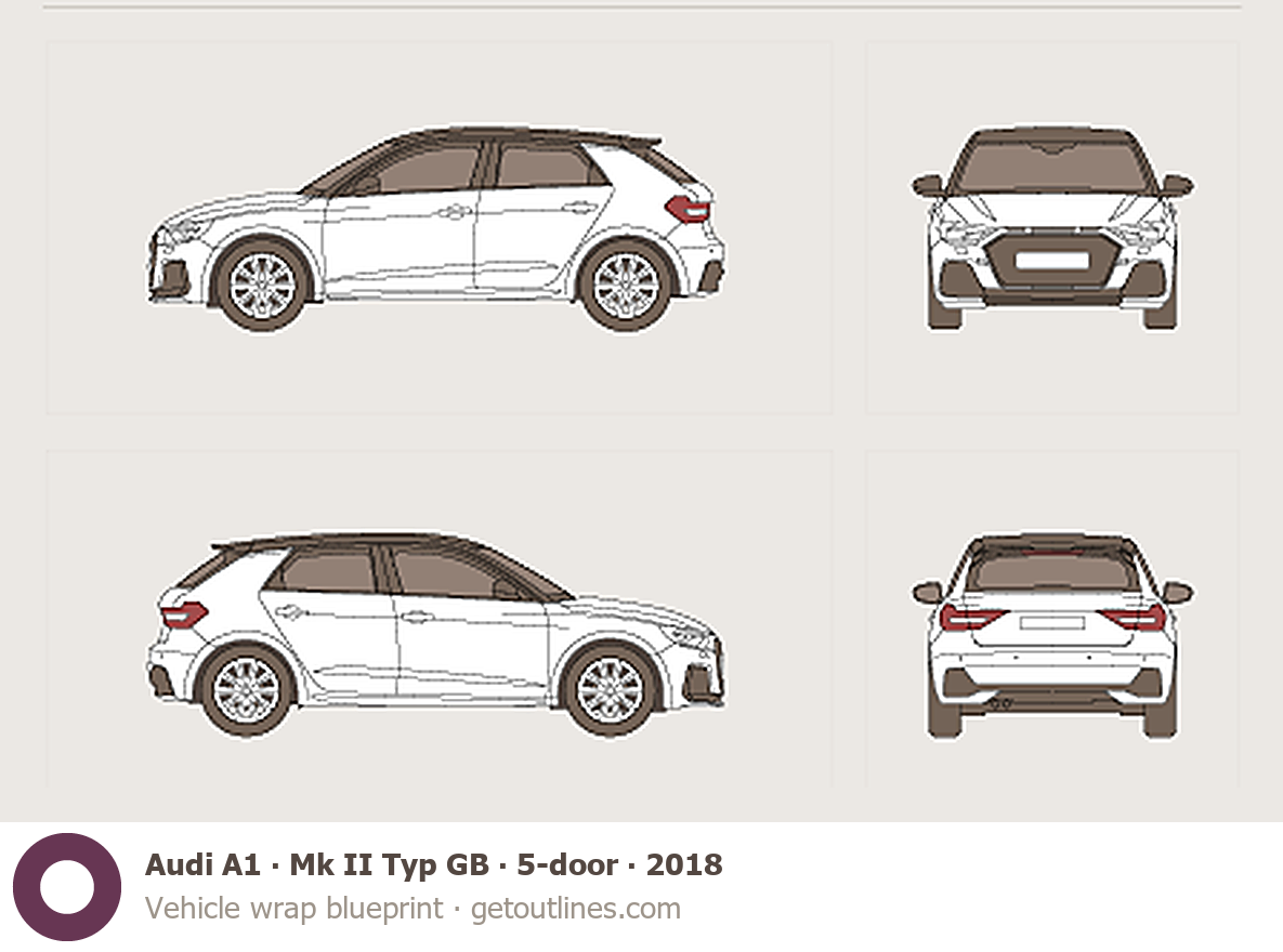 This 2018 Audi A1 Mk II Typ GB 5-door Hatchback blueprint helps designers, wrap studios, and 3D artists simplify their workflow and save valuable time for creative work instead of routine tasks.