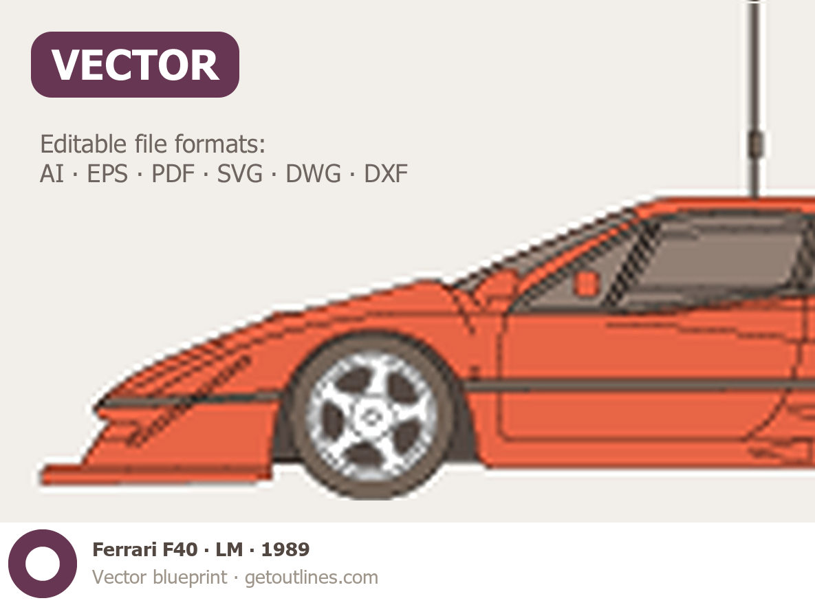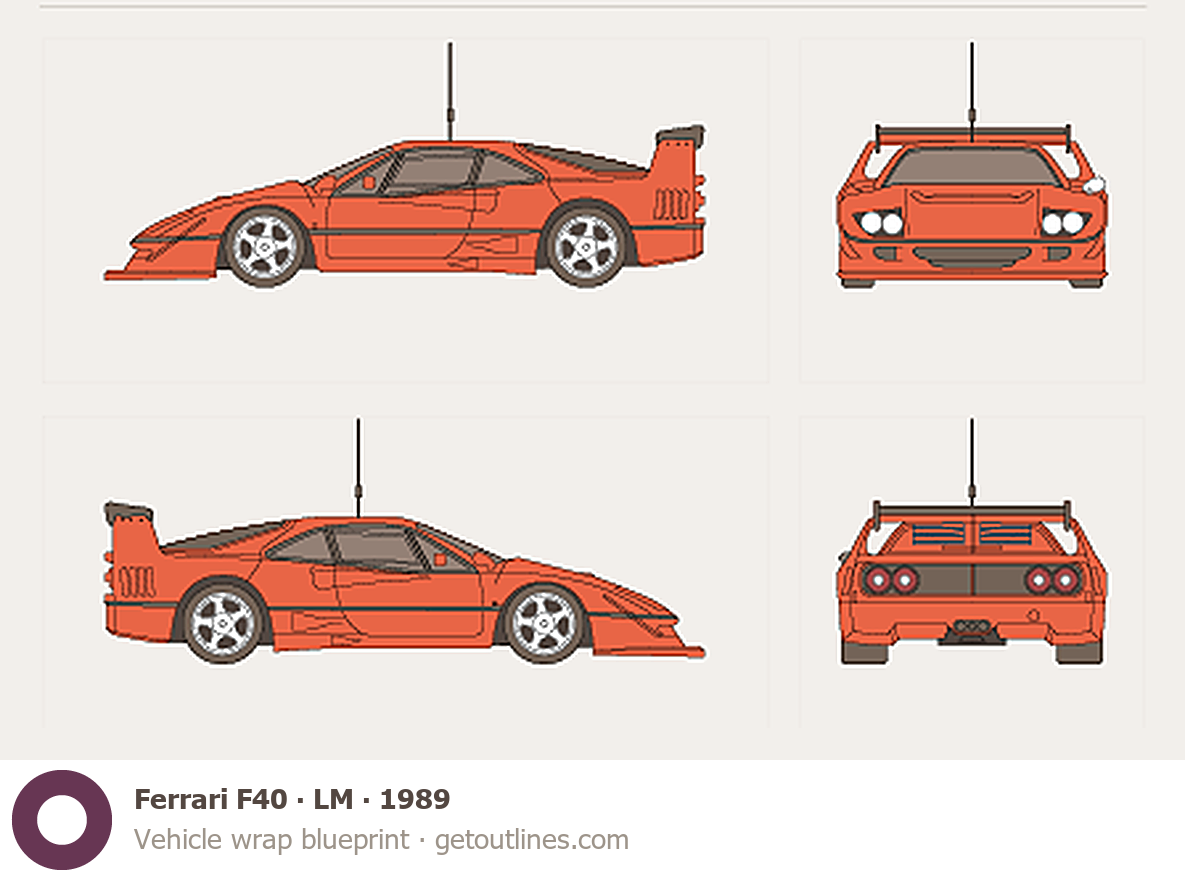 Buy this Ferrari F40 LM blueprint and line drawing in high-quality editable vector file formats. Best for 3D and car wrap design.