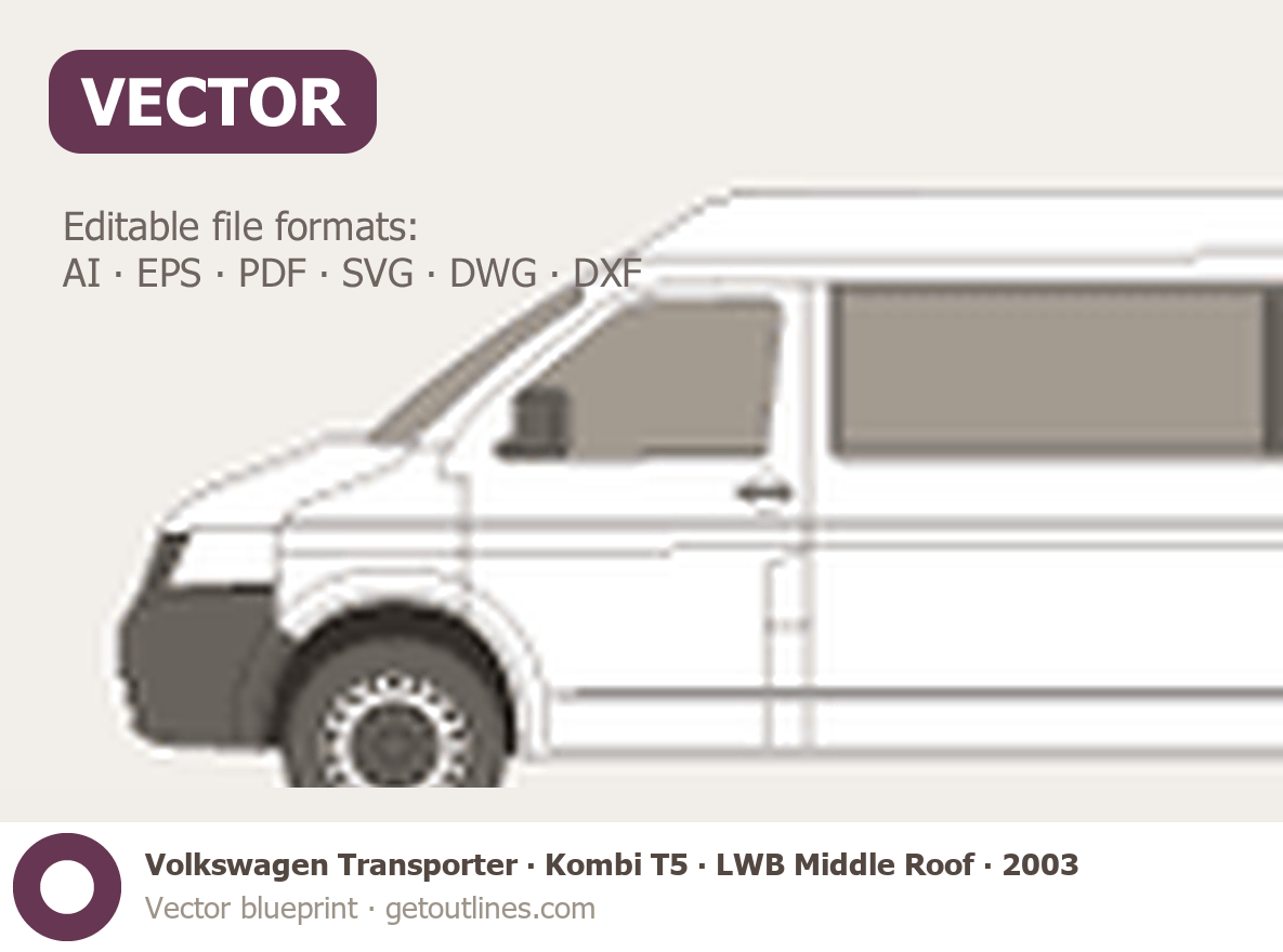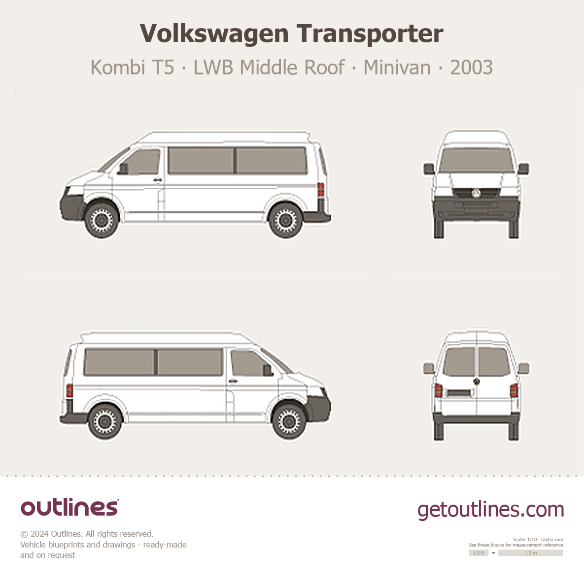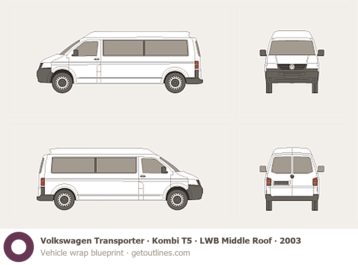This 2003 Volkswagen Transporter Kombi T5 LWB Middle Roof Minivan blueprint helps designers, wrap studios, and 3D artists simplify their workflow and save valuable time for creative work instead of routine tasks.