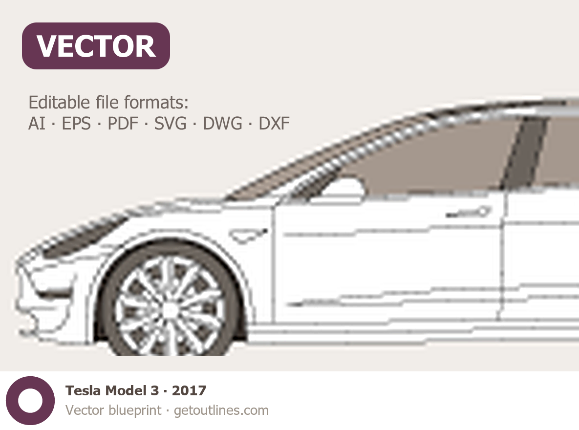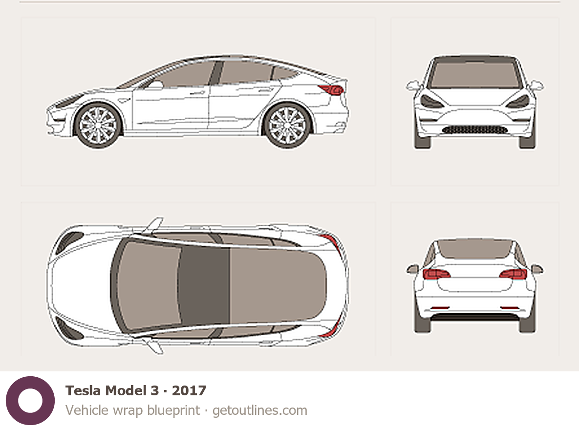 This 2017 Tesla Model 3 Sedan blueprint helps designers, wrap studios, and 3D artists simplify their workflow and save valuable time for creative work instead of routine tasks.