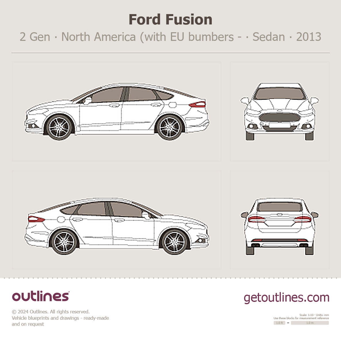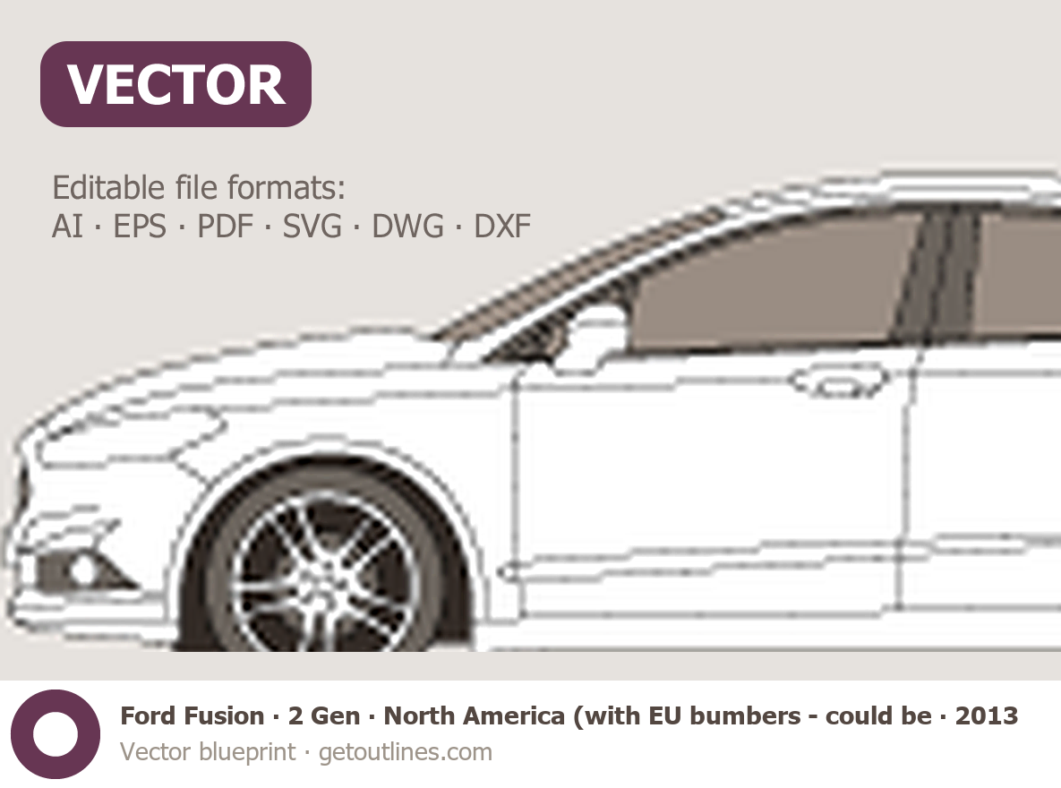 This 2013 Ford Fusion 2 Gen North America (with EU bumbers - could be modified after purshase) Sedan blueprint helps designers, wrap studios, and 3D artists simplify their workflow and save valuable time for creative work instead of routine tasks.