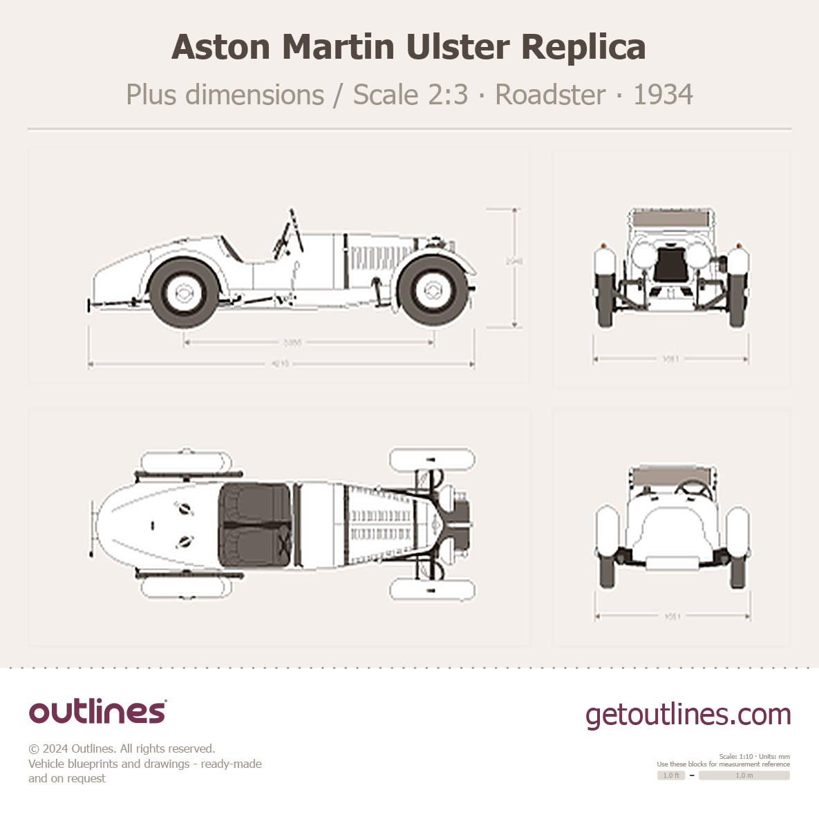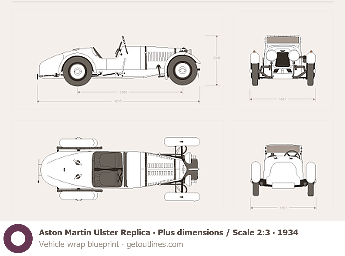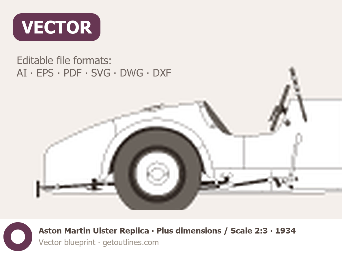 Buy this Aston Martin Ulster Replica blueprint and line drawing in high-quality editable vector file formats. Best for 3D and car wrap design.