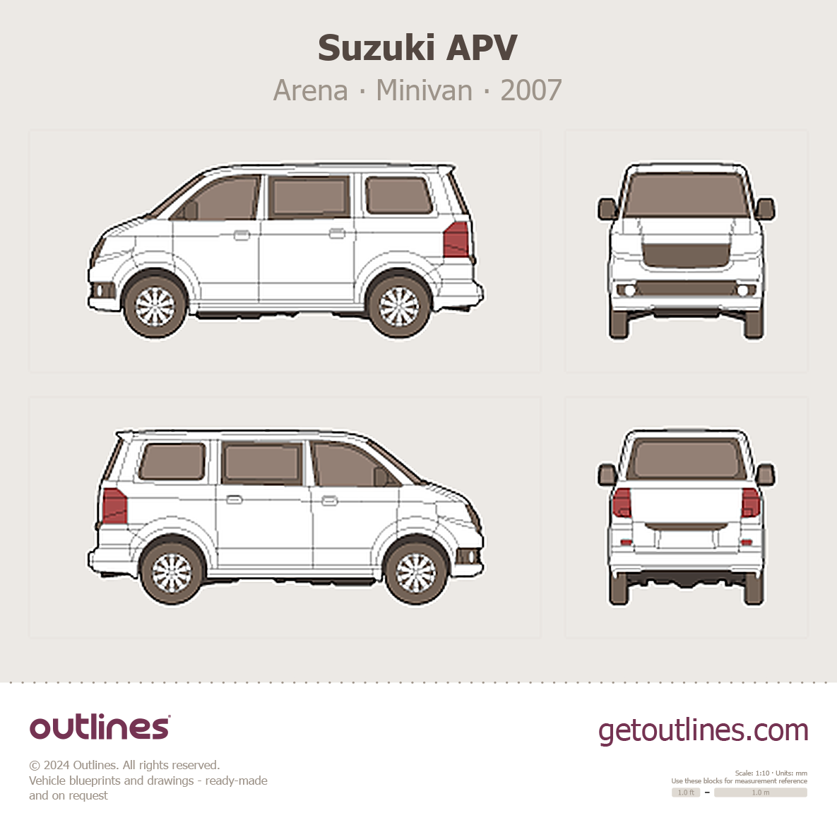 This is a blueprint of the APV, produced by carmaker Suzuki in 2007 - 2025. It features a Minivan body design and is classified as a Commercial vehicle.