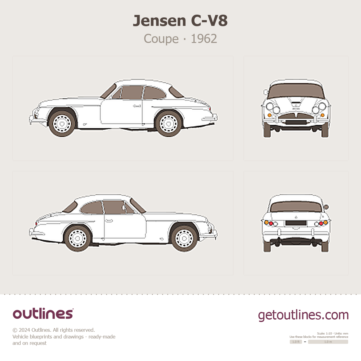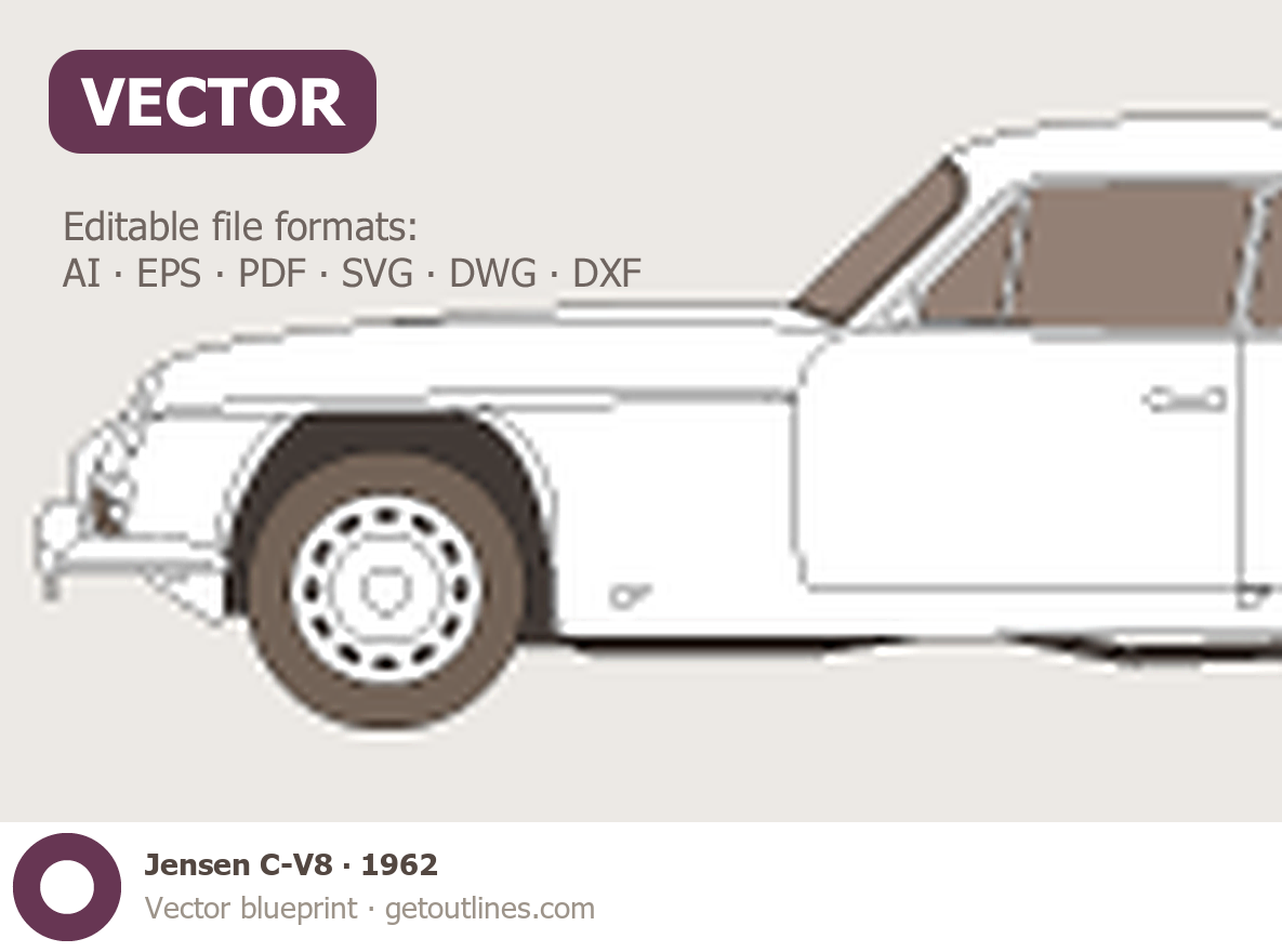 Buy this Jensen C-V8 blueprint and line drawing in high-quality editable vector file formats. Best for 3D and car wrap design.