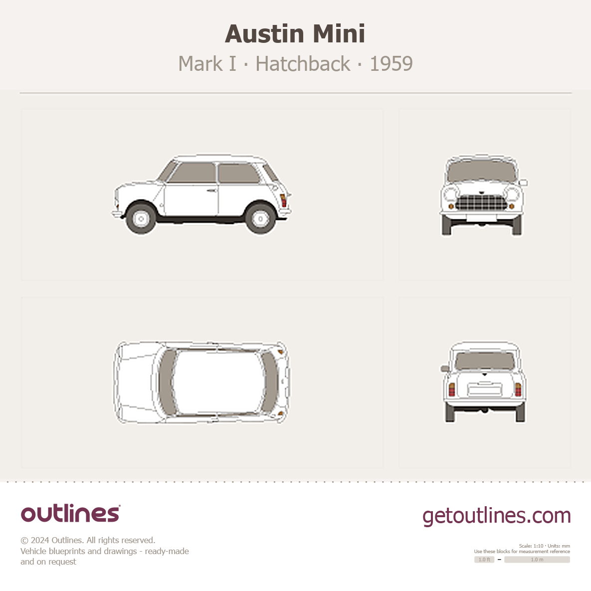 This is a blueprint of the Mini, produced by carmaker Austin in 1959 - 1967. It features a Hatchback body design and is classified as a Compact vehicle.