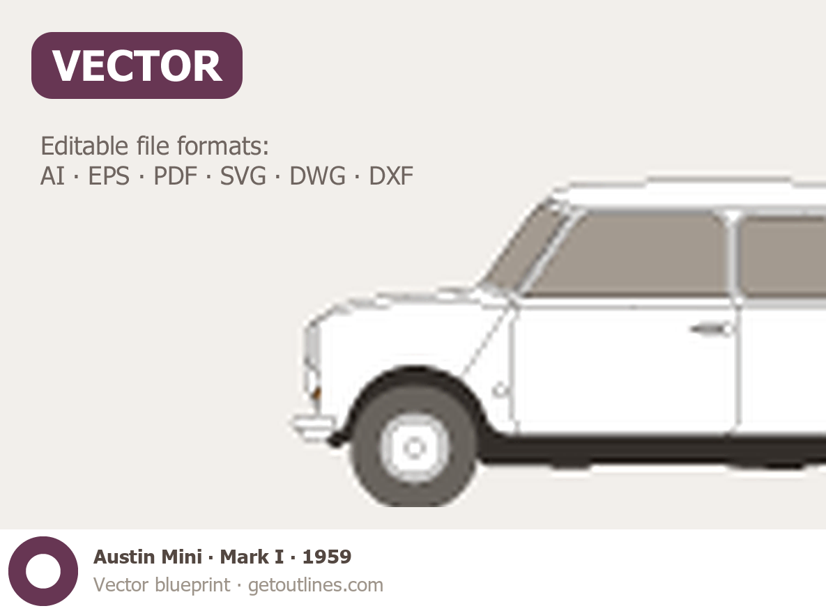 This template is suitable for Austin Mini models from 1959 to 1967, including 1959, 1960, 1961, 1962, and 1967 model years, and is commonly used for vehicle wrap and signage design.
