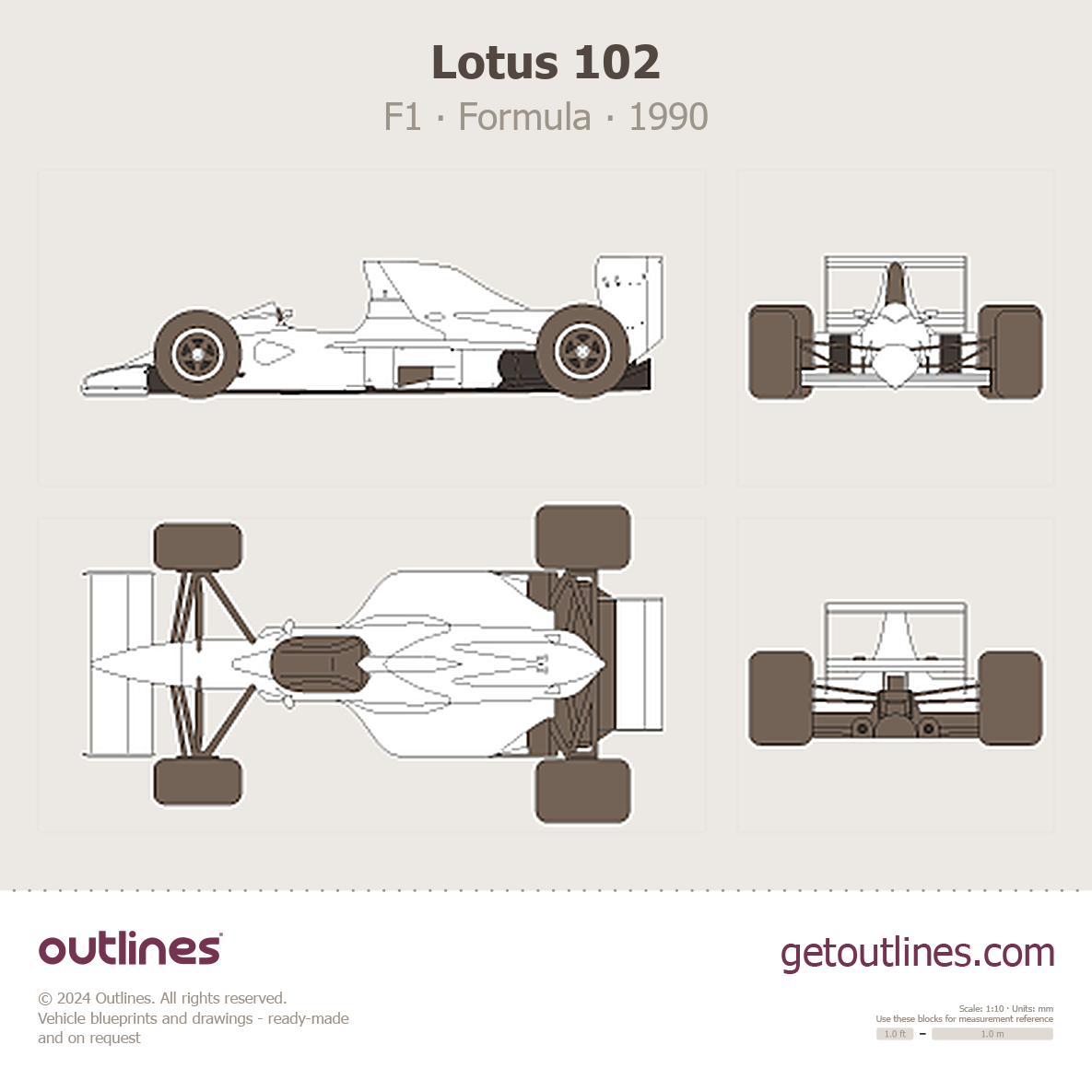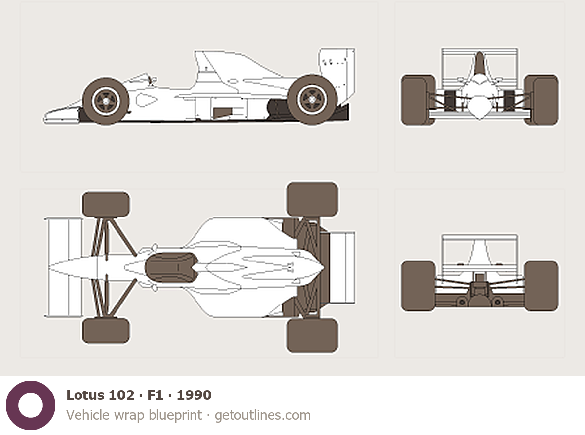 Buy this Lotus 102 F1 blueprint and line drawing in high-quality editable vector file formats. Best for 3D and car wrap design.