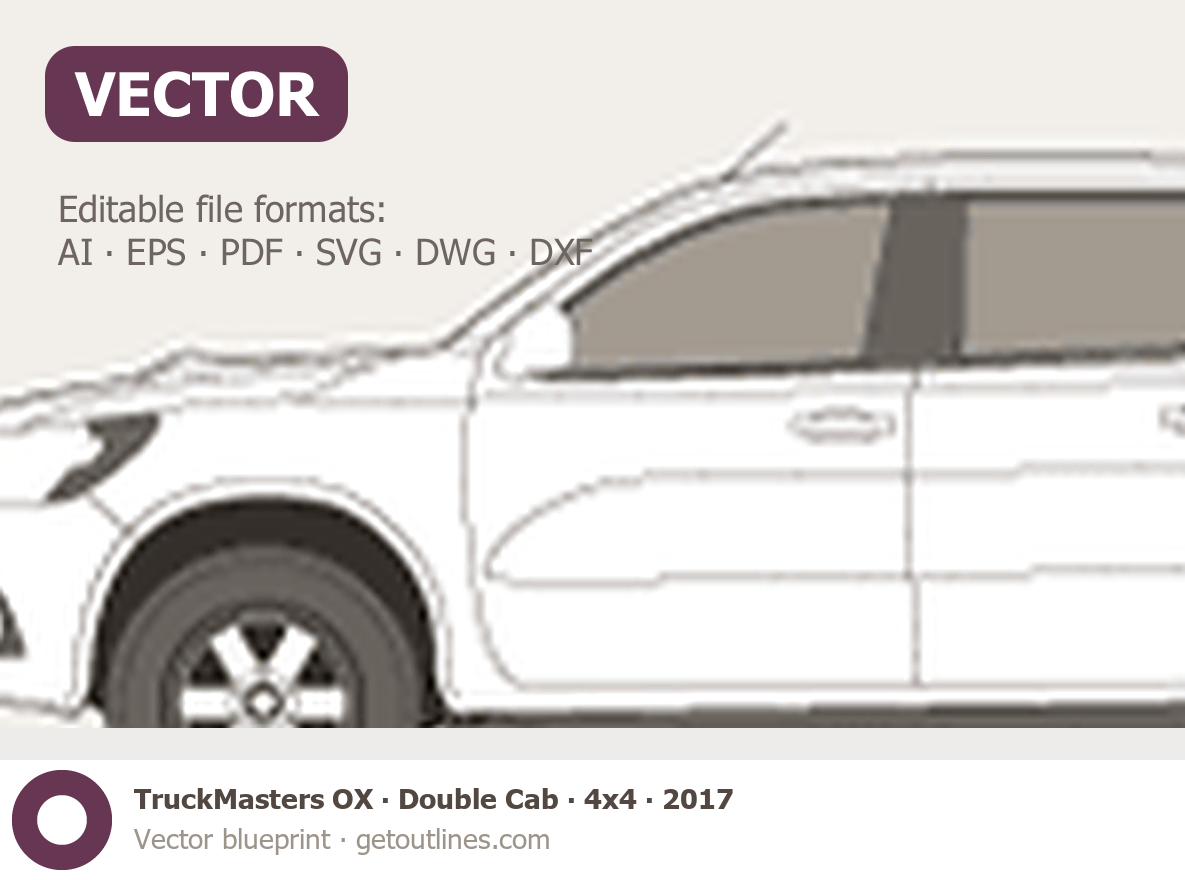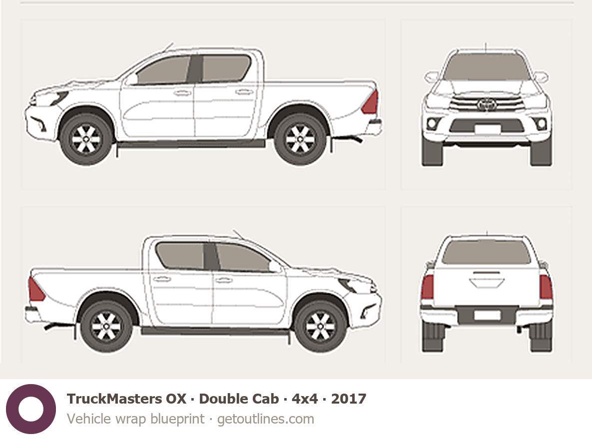This 2017 TruckMasters OX Double Cab 4x4 Pickup Truck blueprint helps designers, wrap studios, and 3D artists simplify their workflow and save valuable time for creative work instead of routine tasks.