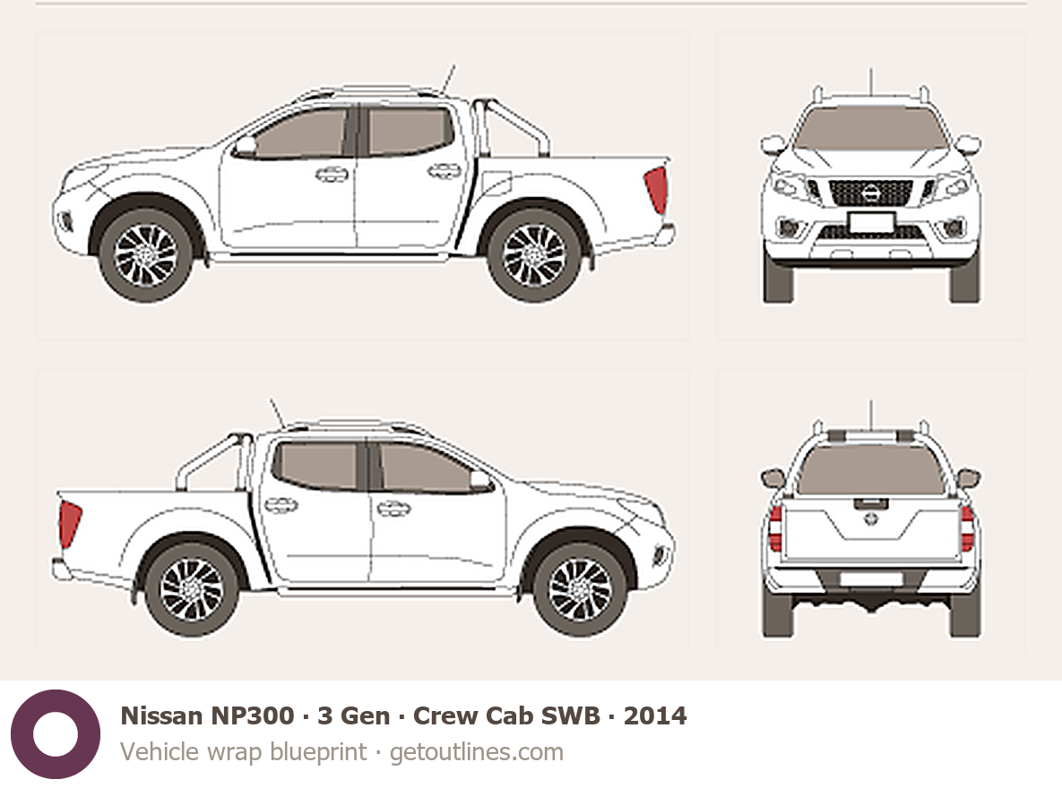 This 2014 Nissan NP300 3 Gen Crew Cab SWB Pickup Truck blueprint helps designers, wrap studios, and 3D artists simplify their workflow and save valuable time for creative work instead of routine tasks.