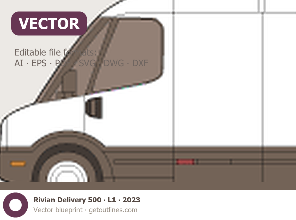Buy this Rivian Delivery 500 blueprint and line drawing in high-quality editable vector file formats. Best for 3D and car wrap design.