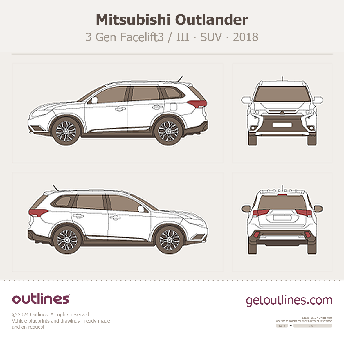 This is a blueprint of the Outlander, produced by carmaker Mitsubishi in 2018 - Present (2025, 2026). It features a SUV body design and is classified as a Crossover vehicle.
