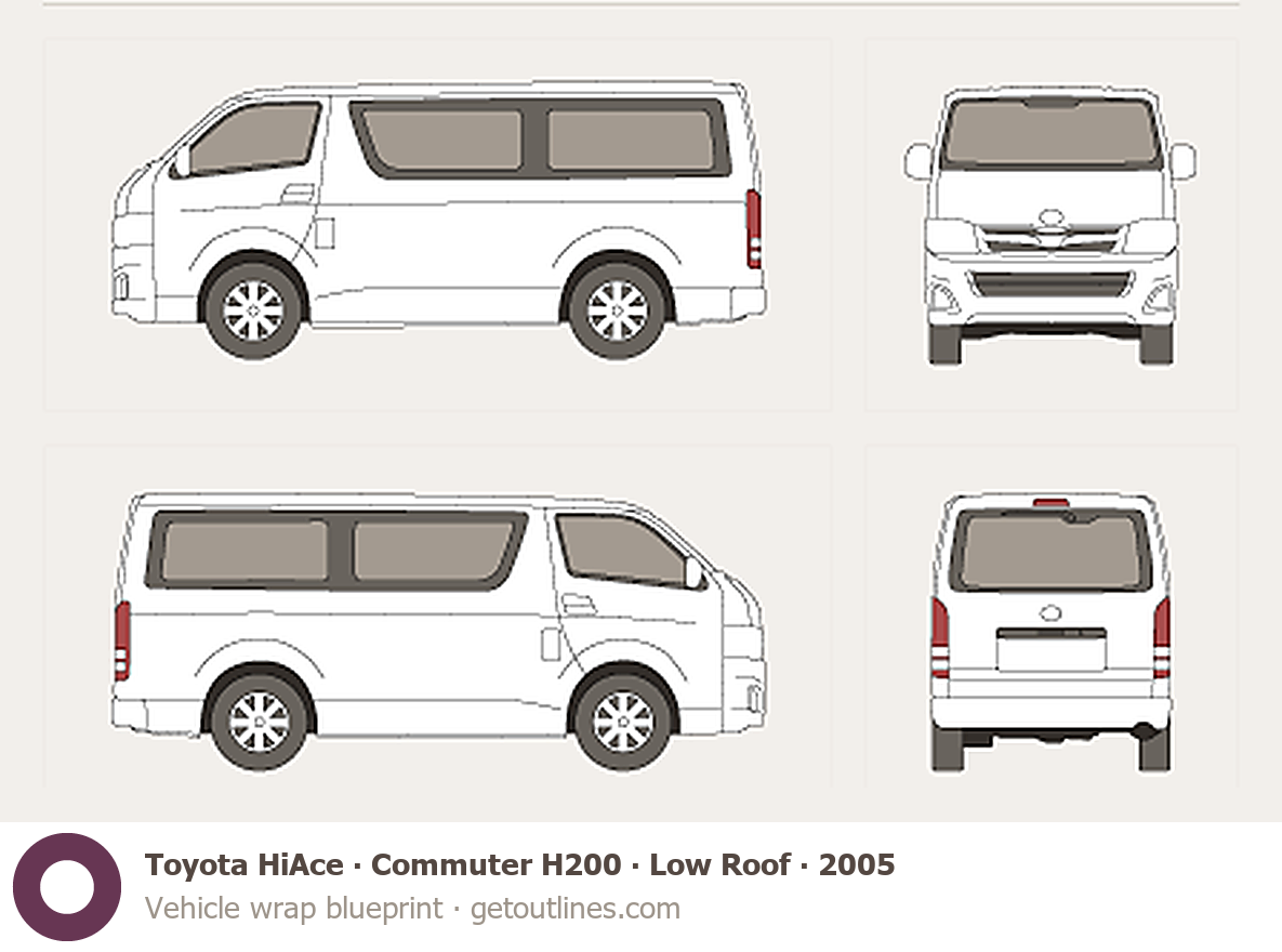 This 2005 Toyota HiAce Commuter H200 Low Roof Wagon blueprint helps designers, wrap studios, and 3D artists simplify their workflow and save valuable time for creative work instead of routine tasks.