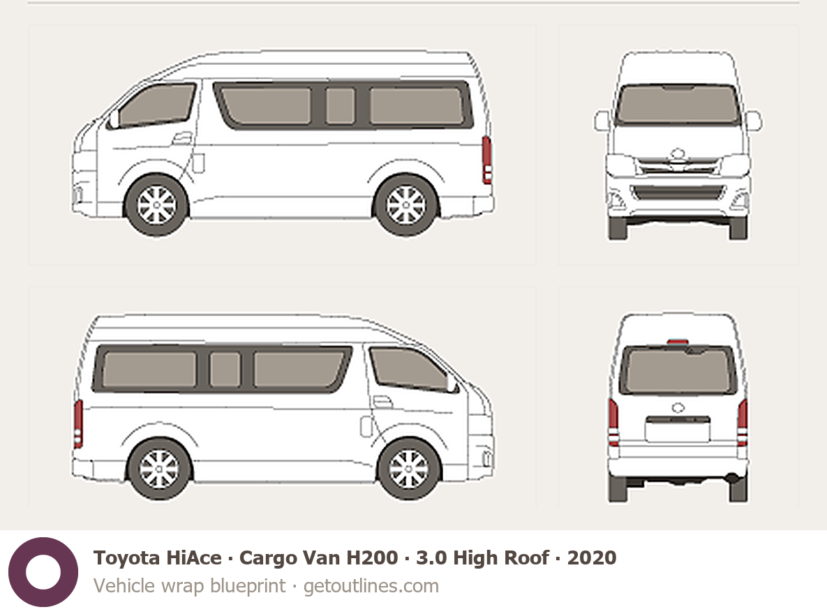 This 2020 Toyota HiAce Cargo Van H200 3.0 High Roof Wagon blueprint helps designers, wrap studios, and 3D artists simplify their workflow and save valuable time for creative work instead of routine tasks.