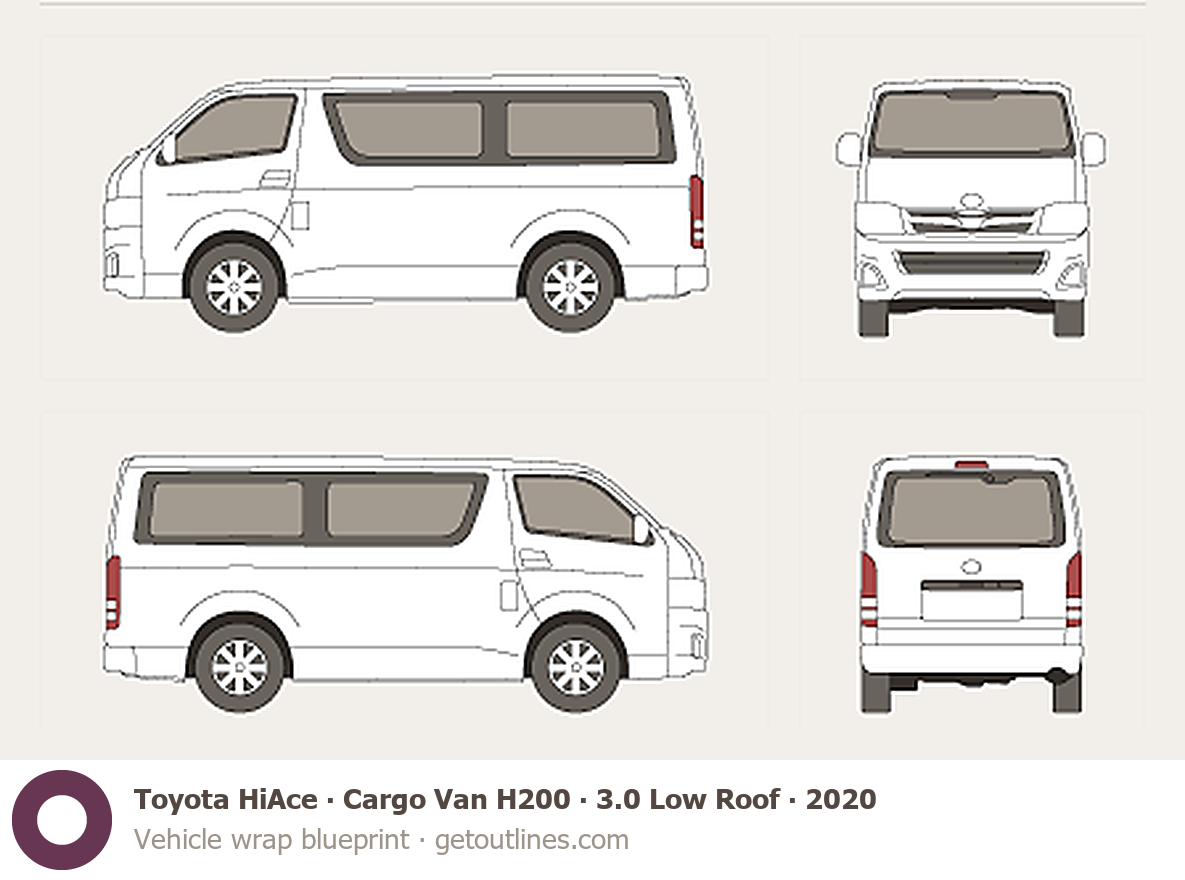 This 2020 Toyota HiAce Cargo Van H200 3.0 Low Roof Wagon blueprint helps designers, wrap studios, and 3D artists simplify their workflow and save valuable time for creative work instead of routine tasks.
