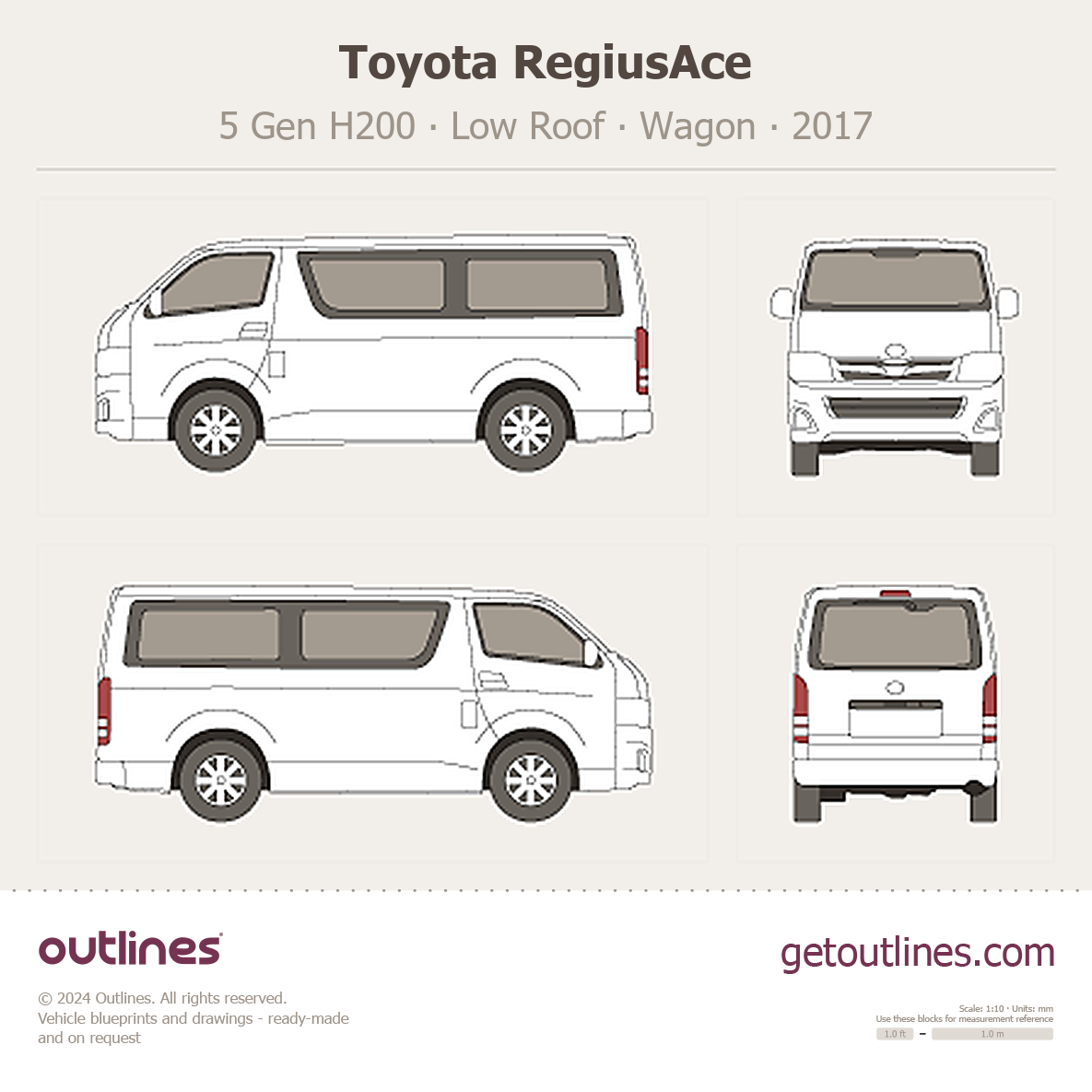 Buy this Toyota RegiusAce 5 Gen H200 blueprint and line drawing in high-quality editable vector file formats. Best for 3D and car wrap design.