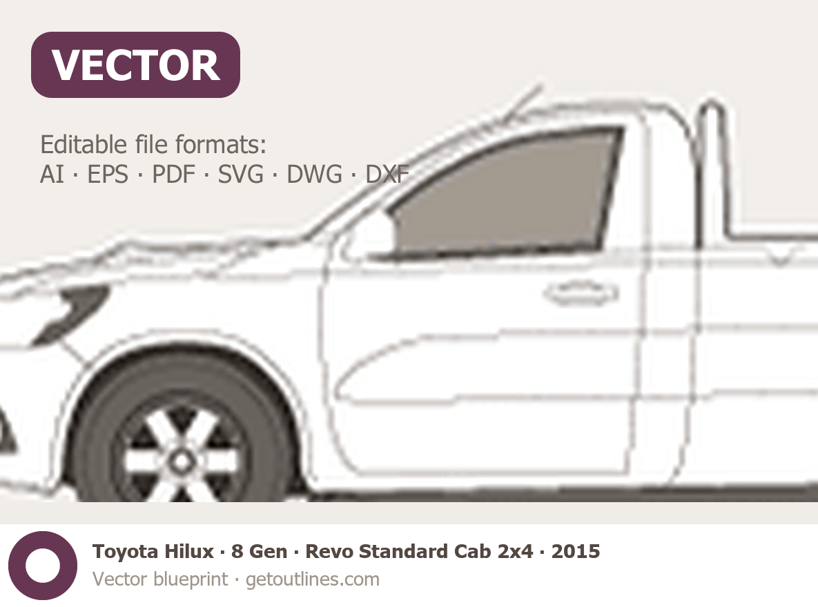 This 2015 Toyota Hilux 8 Gen Revo Standard Cab 2x4 Pickup Truck blueprint helps designers, wrap studios, and 3D artists simplify their workflow and save valuable time for creative work instead of routine tasks.