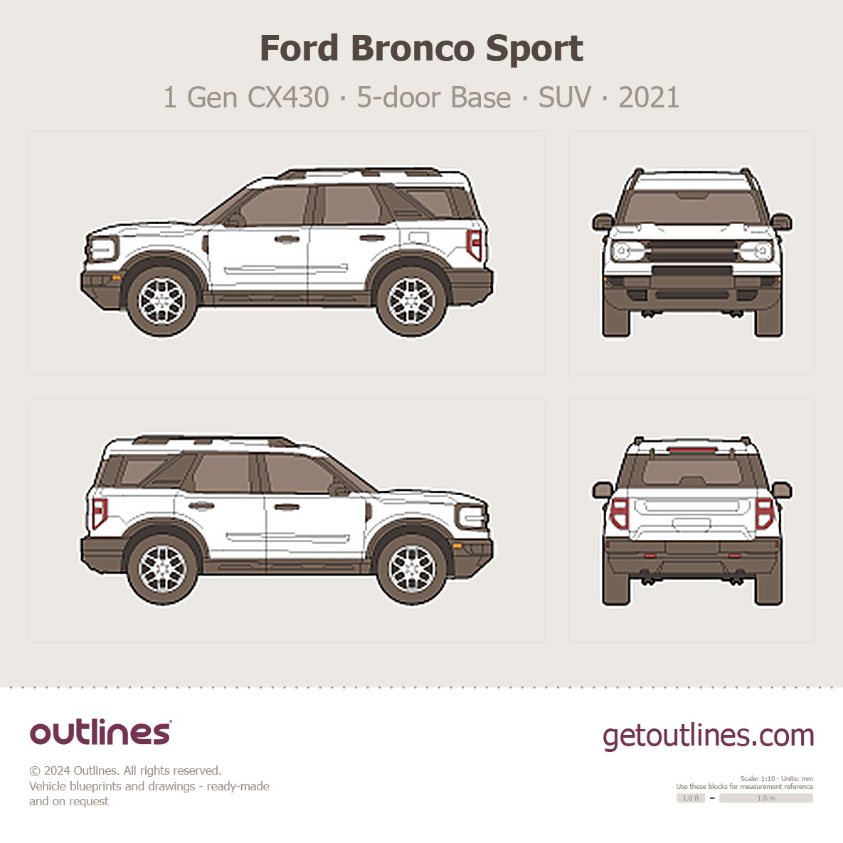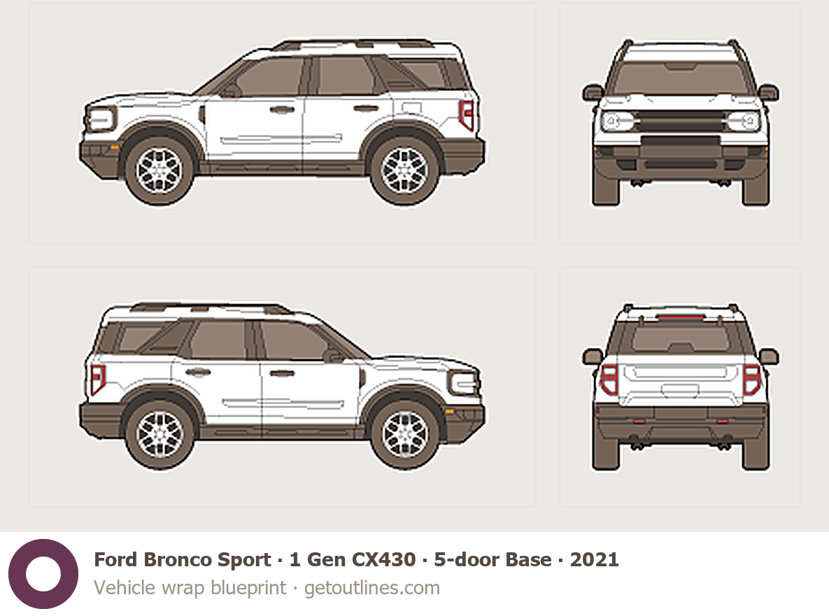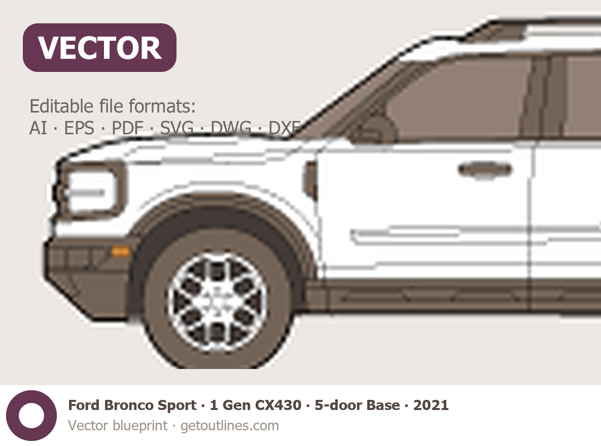 Buy this Ford Bronco Sport 1 Gen CX430 blueprint and line drawing in high-quality editable vector file formats. Best for 3D and car wrap design.