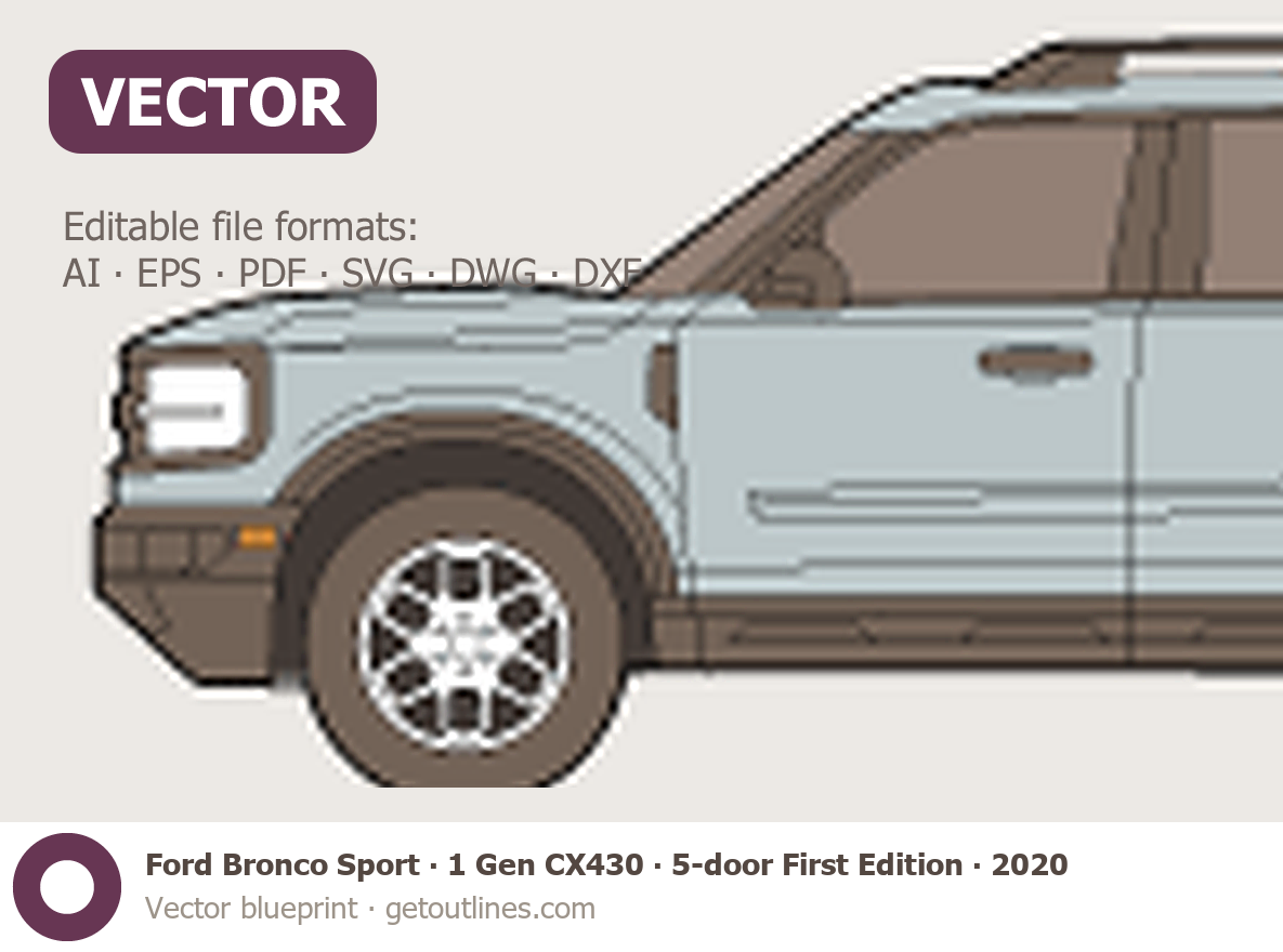 Buy this Ford Bronco Sport 1 Gen CX430 blueprint and line drawing in high-quality editable vector file formats. Best for 3D and car wrap design.