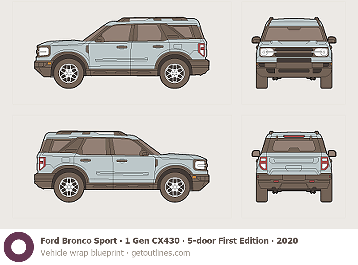 This 2020 Ford Bronco Sport 1 Gen CX430 5-door First Edition SUV blueprint helps designers, wrap studios, and 3D artists simplify their workflow and save valuable time for creative work instead of routine tasks.