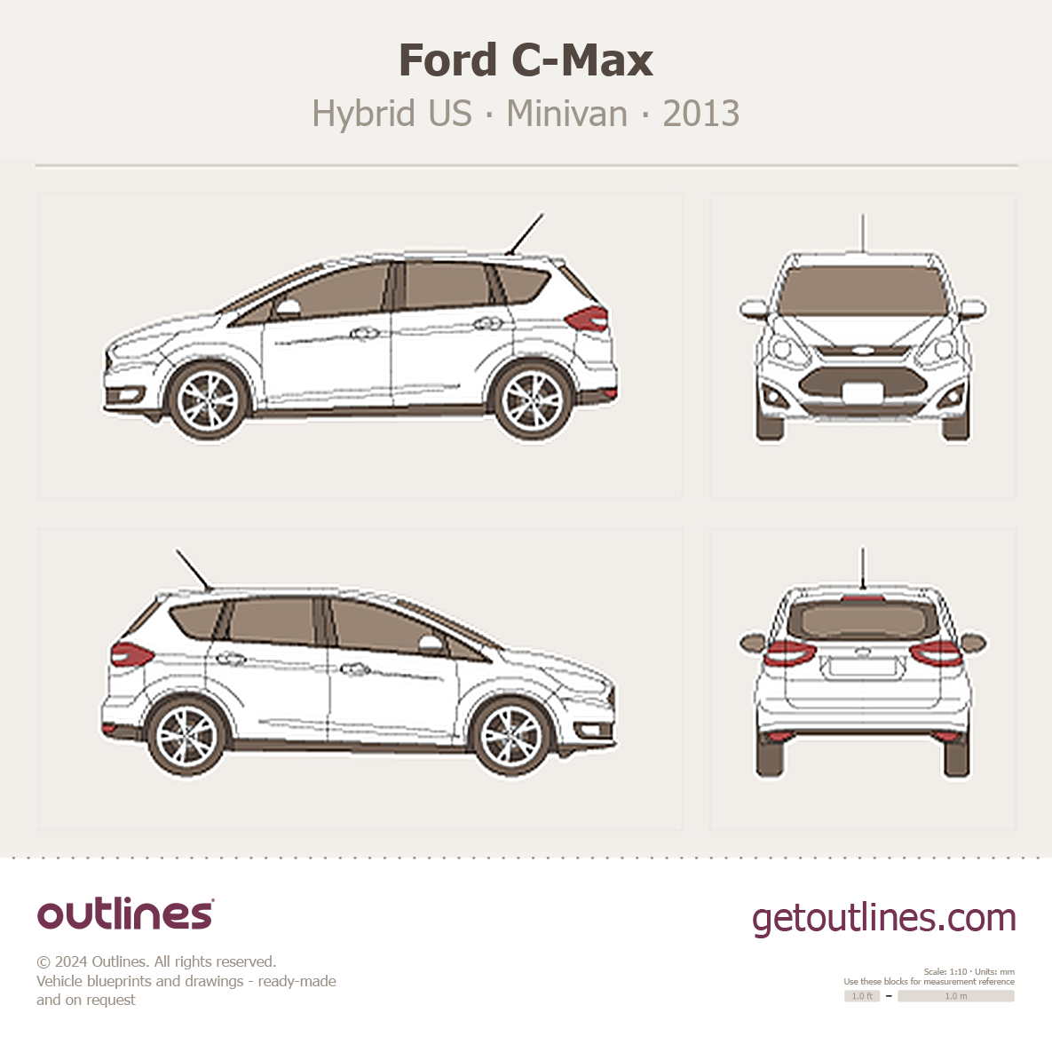This is a blueprint of the C-Max, produced by carmaker Ford in 2013 - 2018. It features a Minivan body design and is classified as a Family vehicle.