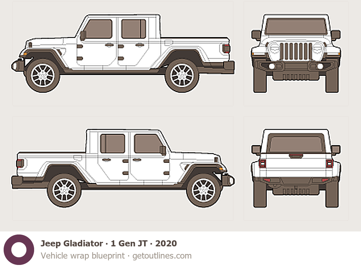 This 2020 Jeep Gladiator 1 Gen JT Pickup Truck blueprint helps designers, wrap studios, and 3D artists simplify their workflow and save valuable time for creative work instead of routine tasks.