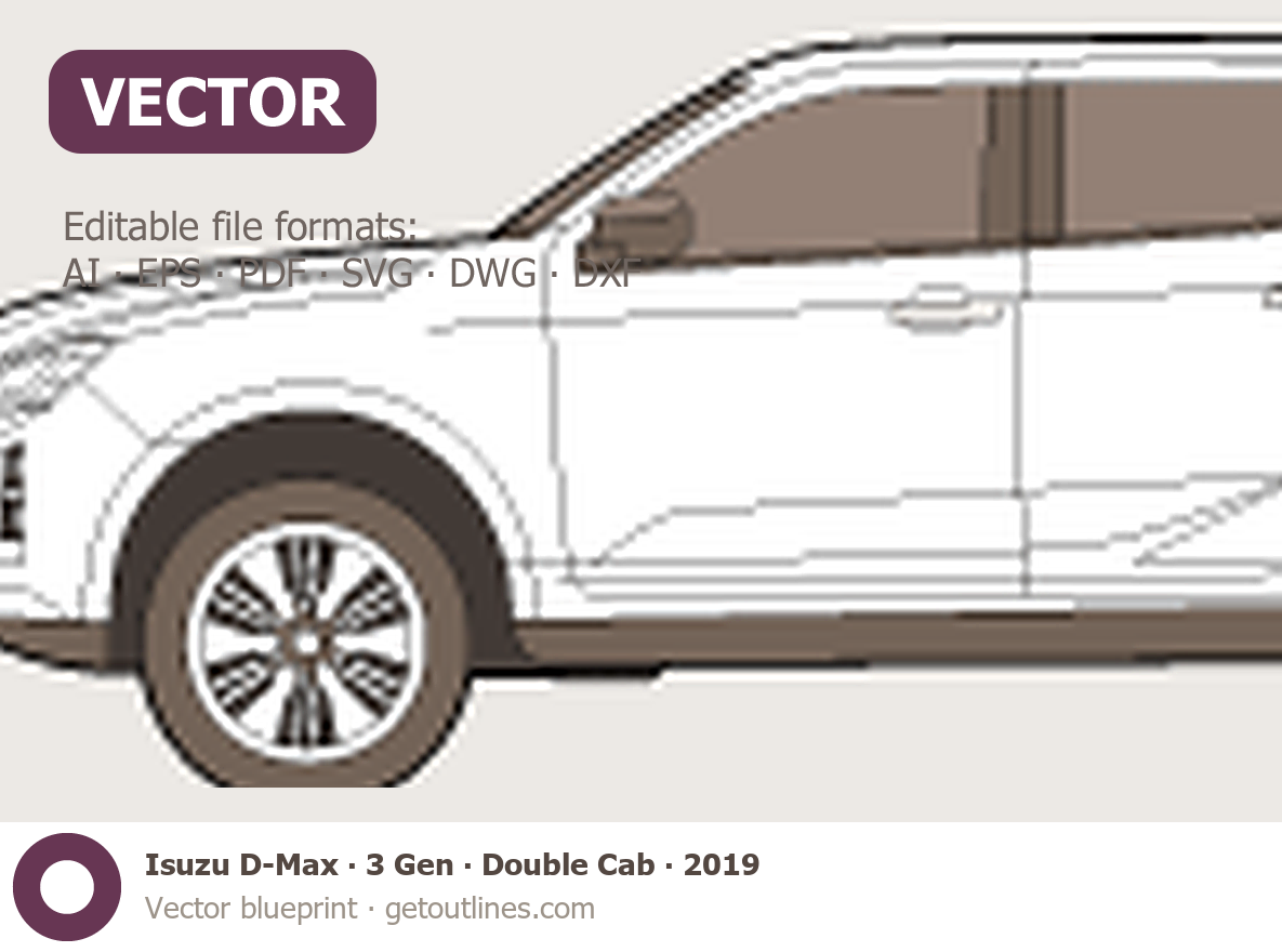 Buy this Isuzu D-Max 3 Gen blueprint and line drawing in high-quality editable vector file formats. Best for 3D and car wrap design.