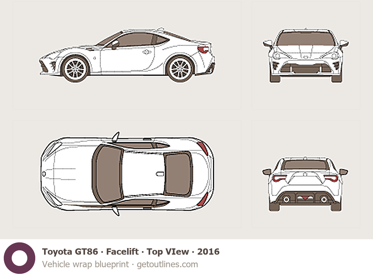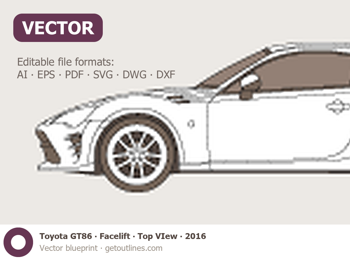 This 2016 Toyota GT86 Facelift Top VIew Coupe blueprint helps designers, wrap studios, and 3D artists simplify their workflow and save valuable time for creative work instead of routine tasks.