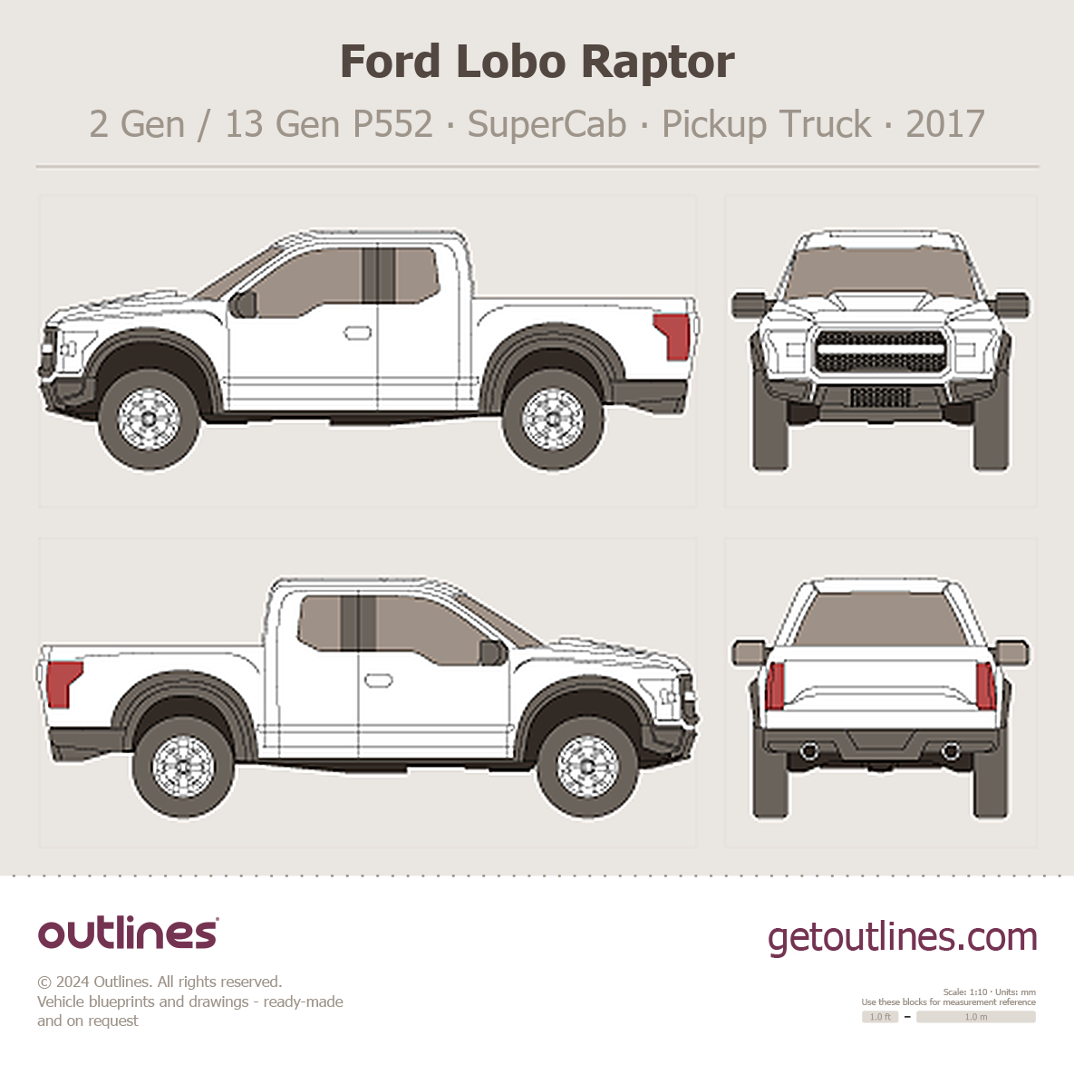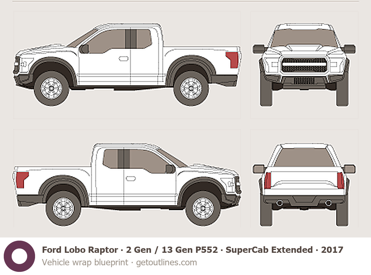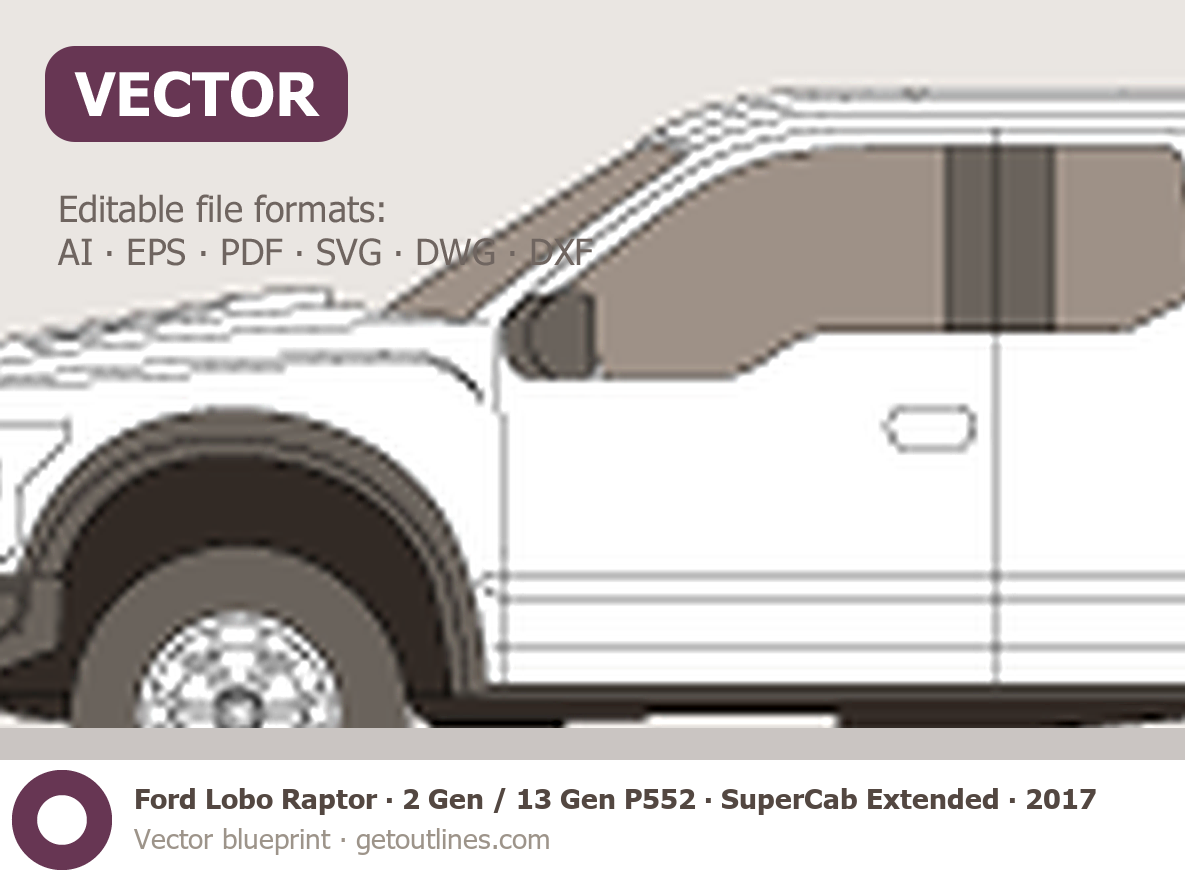 Buy this Ford Lobo Raptor 2 Gen / 13 Gen P552 blueprint and line drawing in high-quality editable vector file formats. Best for 3D and car wrap design.