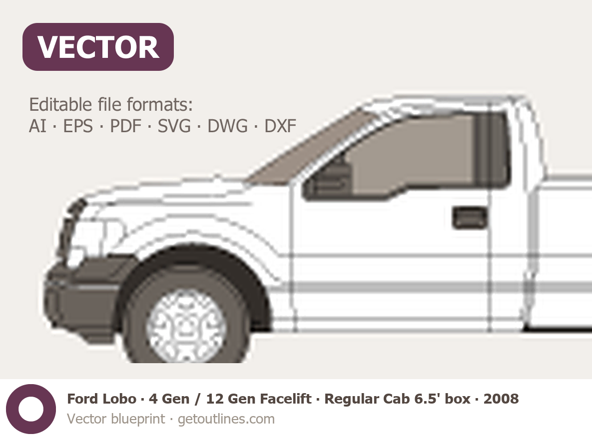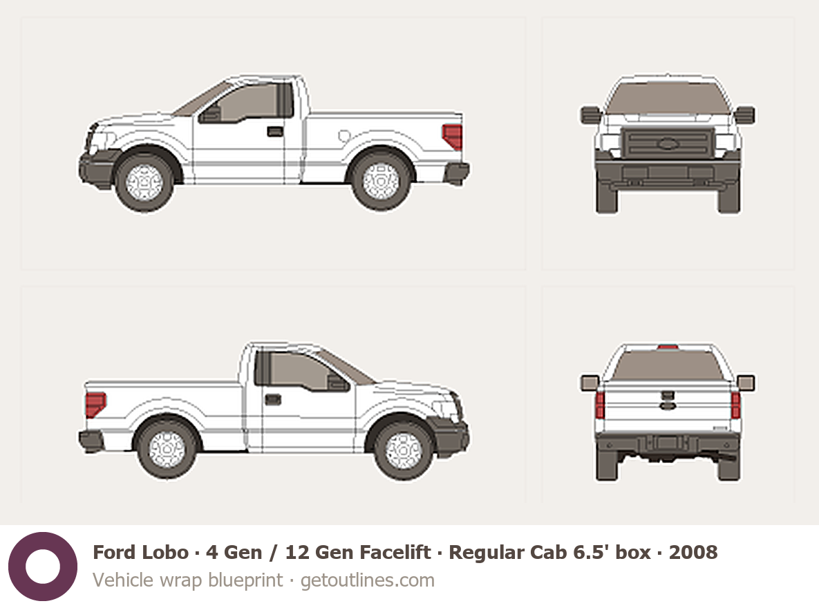 This 2008 Ford Lobo 4 Gen / 12 Gen Facelift Regular Cab 6.5' box Standard Box Pickup Truck blueprint helps designers, wrap studios, and 3D artists simplify their workflow and save valuable time for creative work instead of routine tasks.