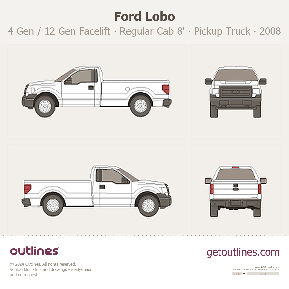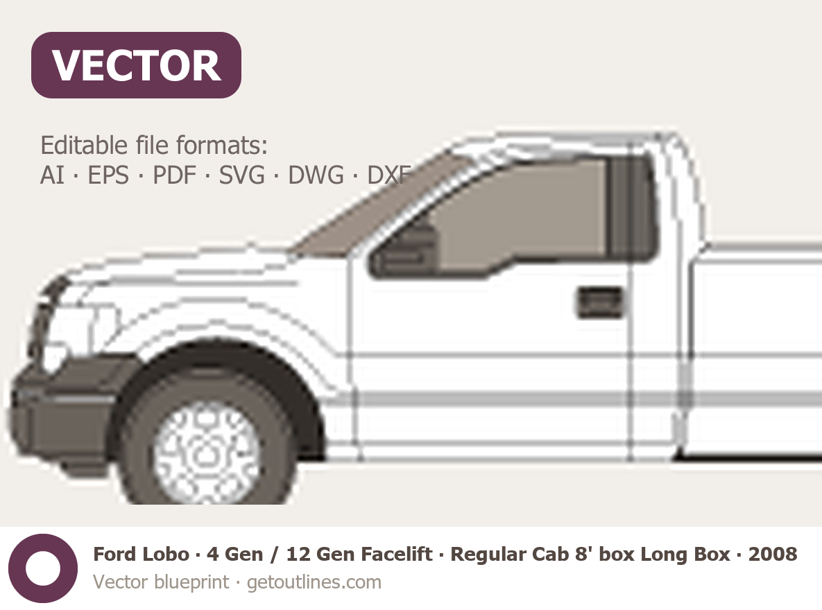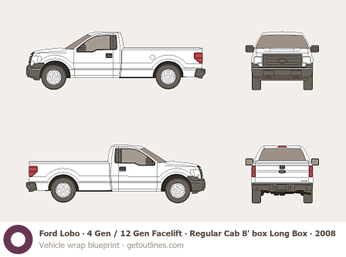 This 2008 Ford Lobo 4 Gen / 12 Gen Facelift Regular Cab 8' box Long Box Pickup Truck blueprint helps designers, wrap studios, and 3D artists simplify their workflow and save valuable time for creative work instead of routine tasks.