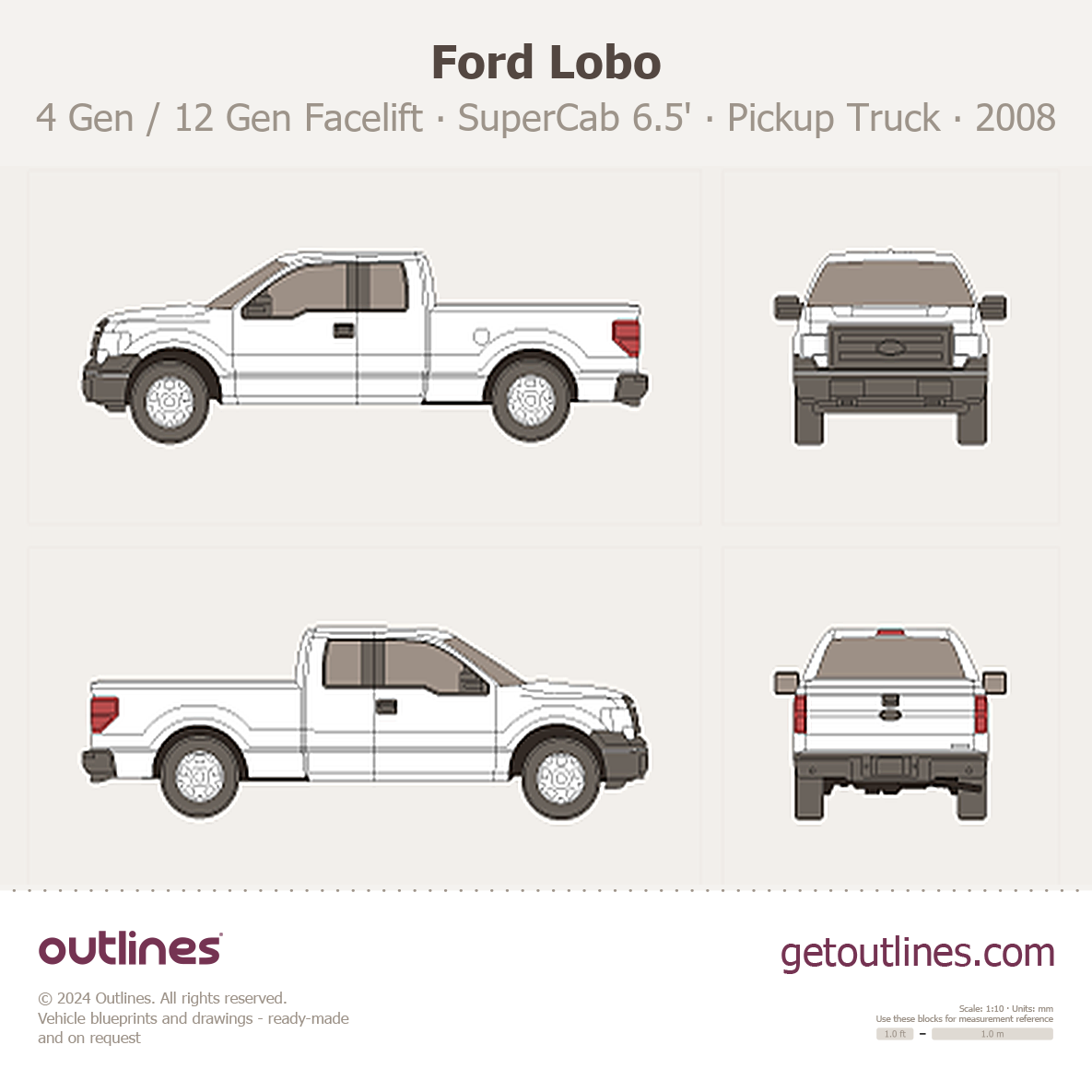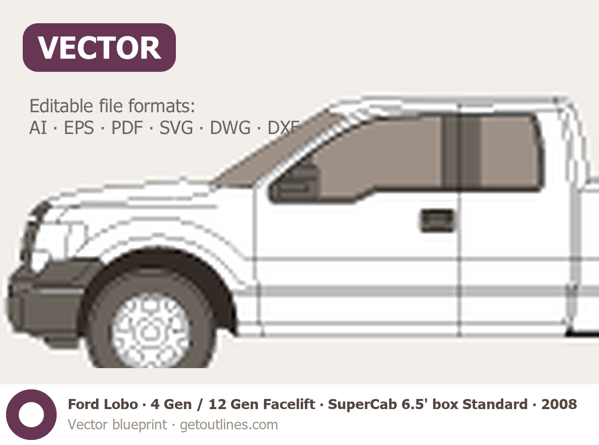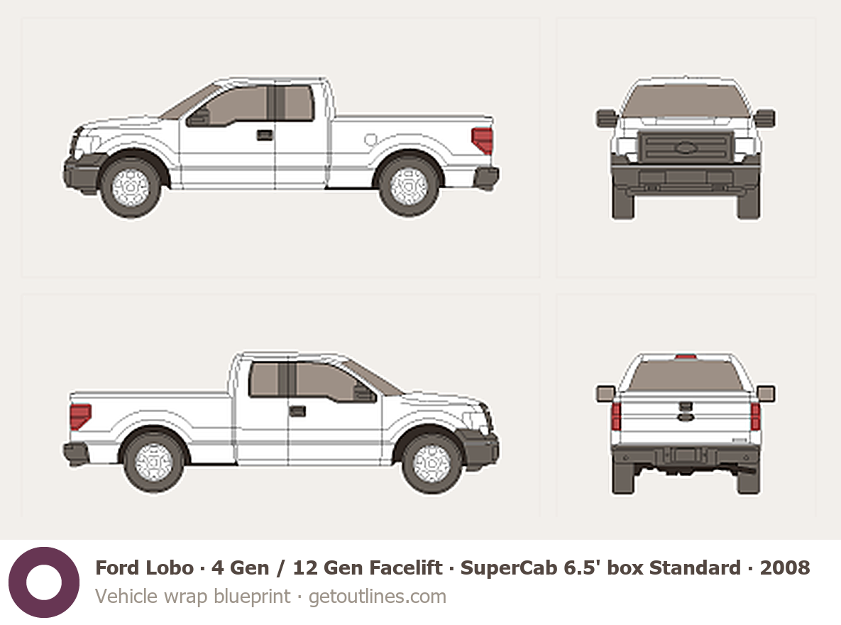 This 2008 Ford Lobo 4 Gen / 12 Gen Facelift SuperCab 6.5' box Standard Box Pickup Truck blueprint helps designers, wrap studios, and 3D artists simplify their workflow and save valuable time for creative work instead of routine tasks.