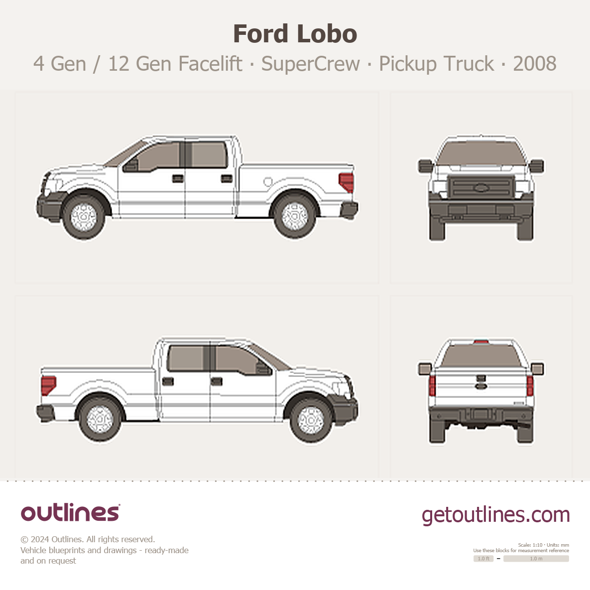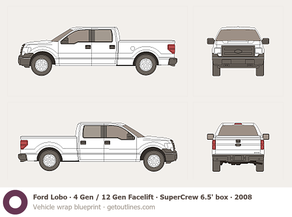 This 2008 Ford Lobo 4 Gen / 12 Gen Facelift SuperCrew 6.5' box Standard Box Pickup Truck blueprint helps designers, wrap studios, and 3D artists simplify their workflow and save valuable time for creative work instead of routine tasks.