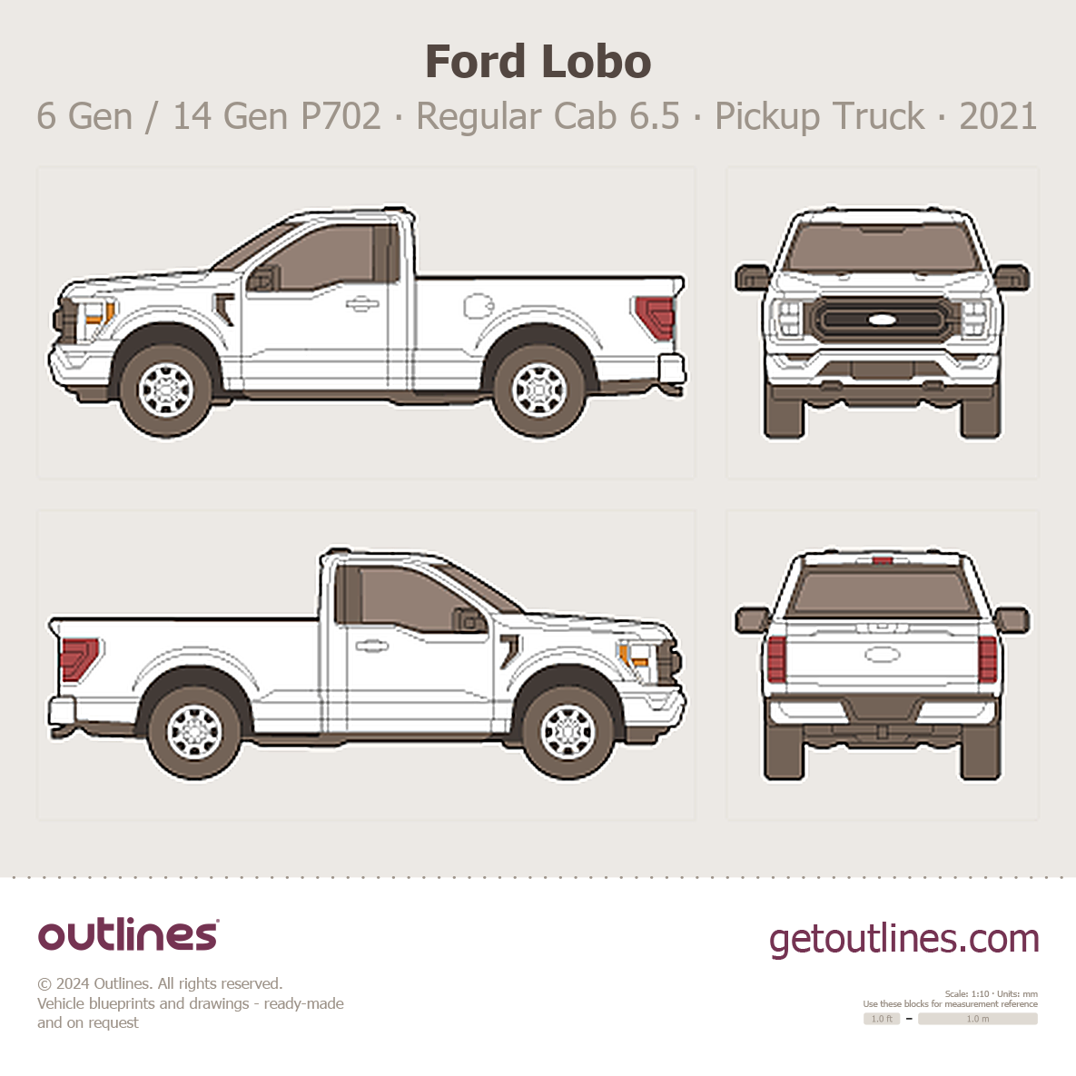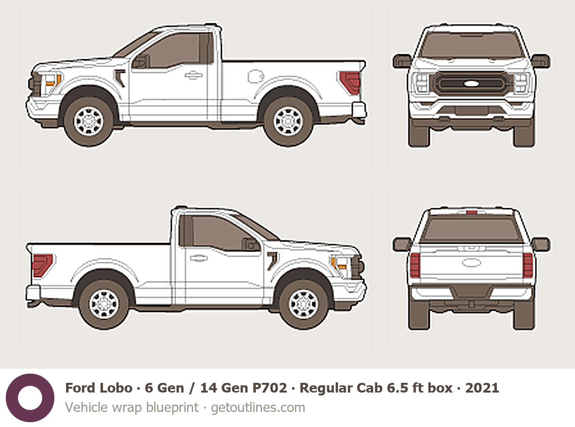 This 2021 Ford Lobo 6 Gen / 14 Gen P702 Regular Cab 6.5 ft box Standard Box Pickup Truck blueprint helps designers, wrap studios, and 3D artists simplify their workflow and save valuable time for creative work instead of routine tasks.