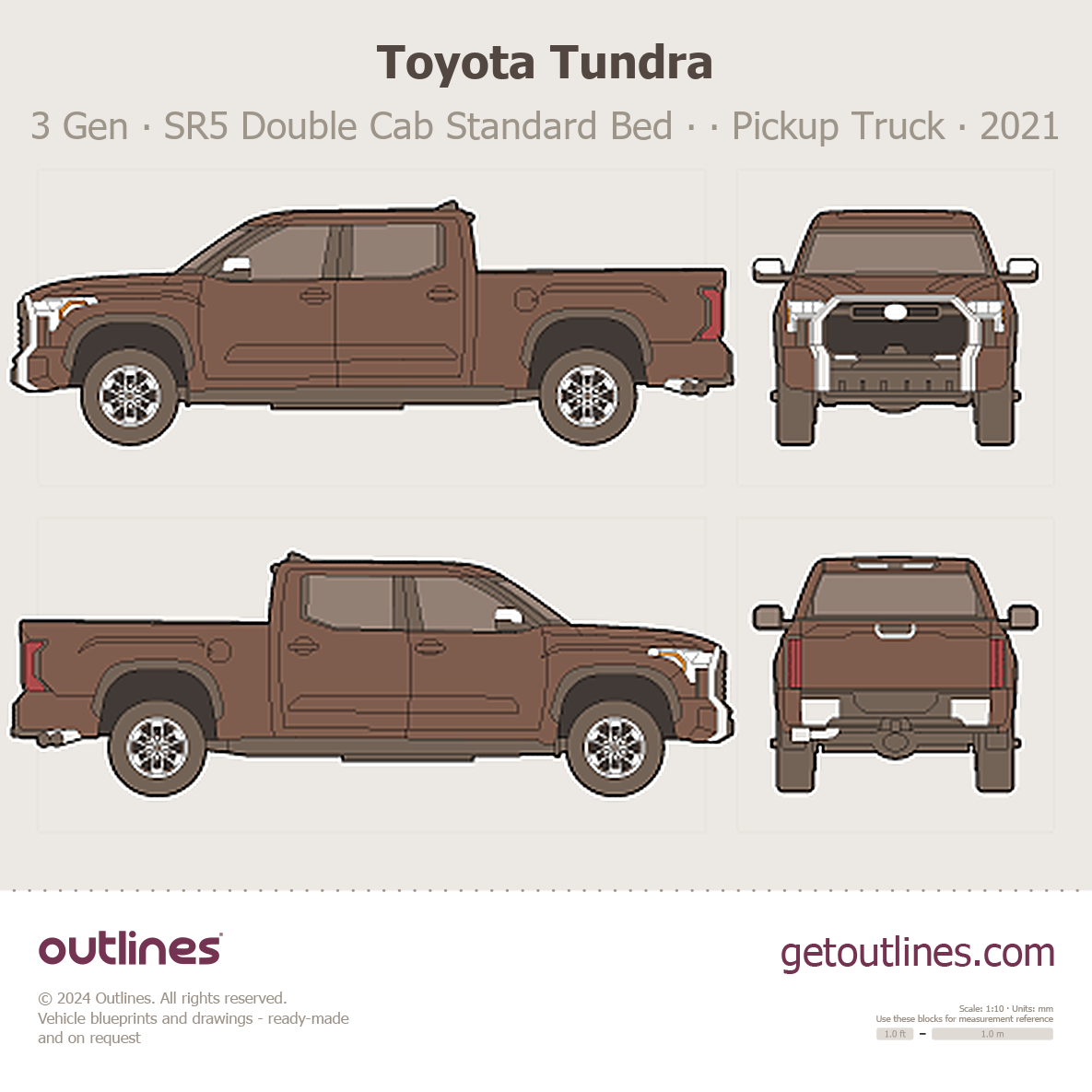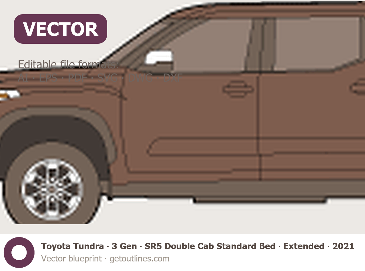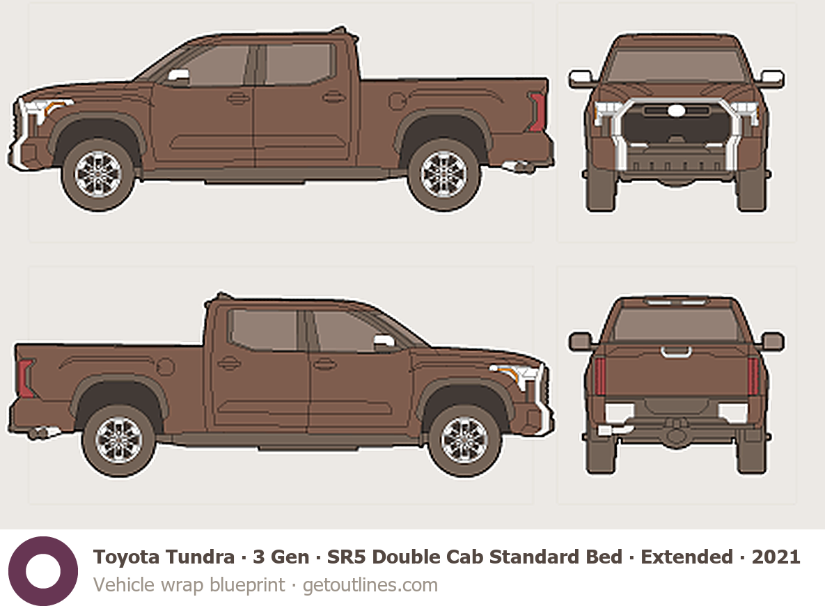 This 2021 Toyota Tundra 3 Gen SR5 Double Cab Standard Bed ∙ Extended Cab ∙ Brown (Wrong Scale) Pickup Truck blueprint helps designers, wrap studios, and 3D artists simplify their workflow and save valuable time for creative work instead of routine tasks.